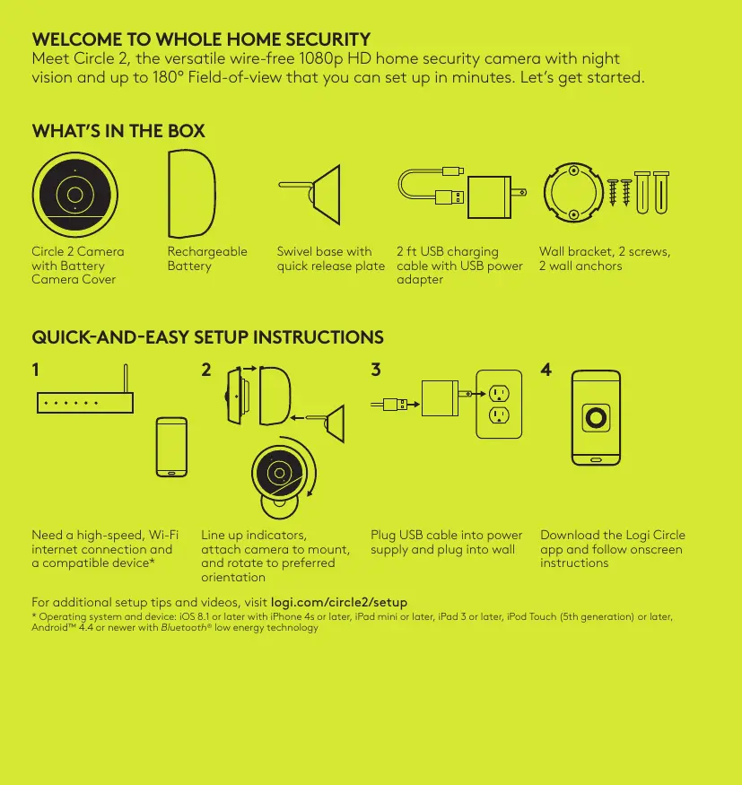 WELCOME TO WHOLE HOME SECURITY Meet Circle 2, the versatile wire-free 1080p HD home security camera with night vision and up to 180° Field-of-view that you can set up in minutes. Let’s get started.