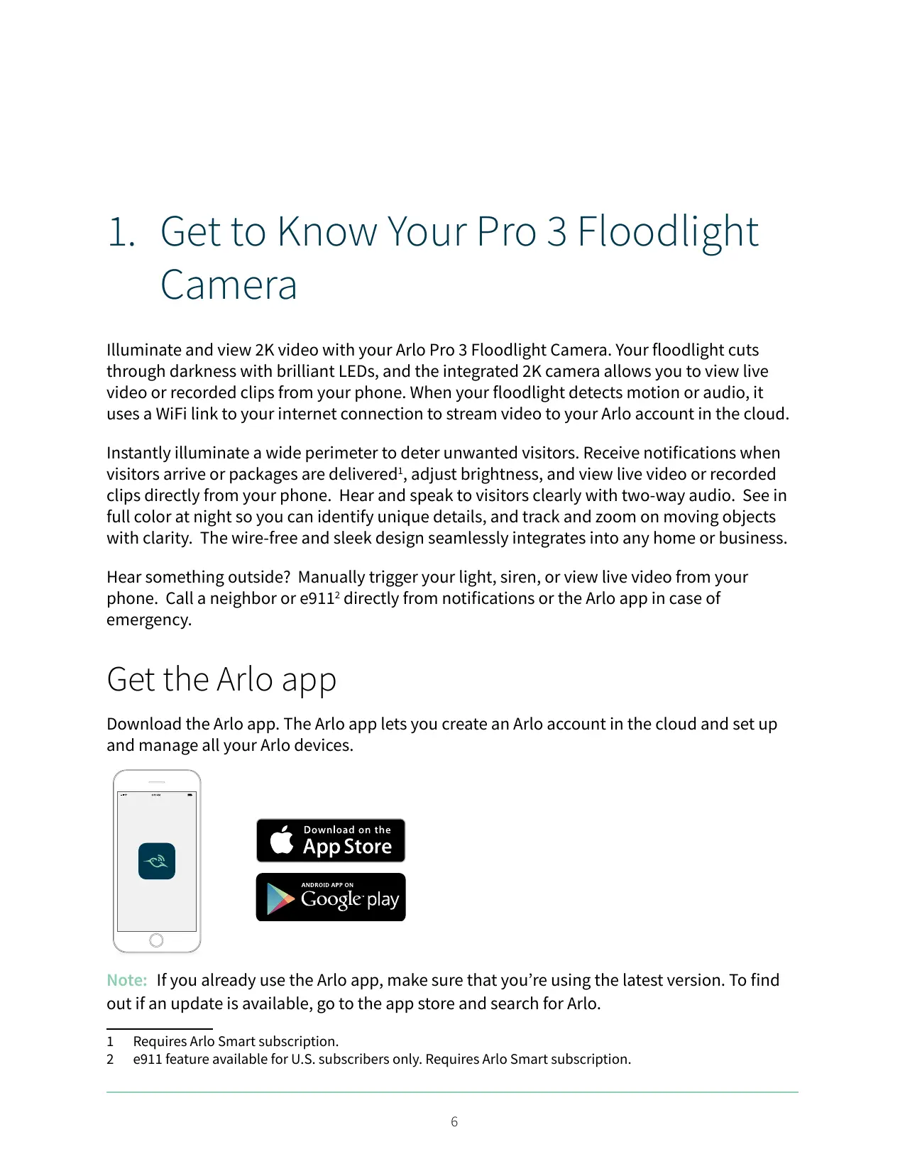 Camera Illuminate and view 2K video with your Arlo Pro 3 Floodlight Camera. Your floodlight cuts through darkness with brilliant LEDs, and the integrated 2K camera allows you to view live video or recorded clips from your phone. When your floodlight detects motion or audio, it uses a WiFi link to your internet connection to stream video to your Arlo account in the cloud. Instantly illuminate a wide perimeter to deter unwanted visitors. Receive notifications when visitors arrive or packages are delivered1, adjust brightness, and view live video or recorded clips directly from your phone. Hear and speak to visitors clearly with two-way audio. See in full color at night so you can identify unique details, and track and zoom on moving objects with clarity. The wire-free and sleek design seamlessly integrates into any home or business. Hear something outside? Manually trigger your light, siren, or view live video from your phone. Call a neighbor or e9112 directly from notifications or the Arlo app in case of emergency. Get the Arlo app Download the Arlo app. The Arlo app lets you create an Arlo account in the cloud and set up and manage all your Arlo devices. Note: If you already use the Arlo app, make sure that you’re using the latest version. To find out if an update is available, go to the app store and search for Arlo.