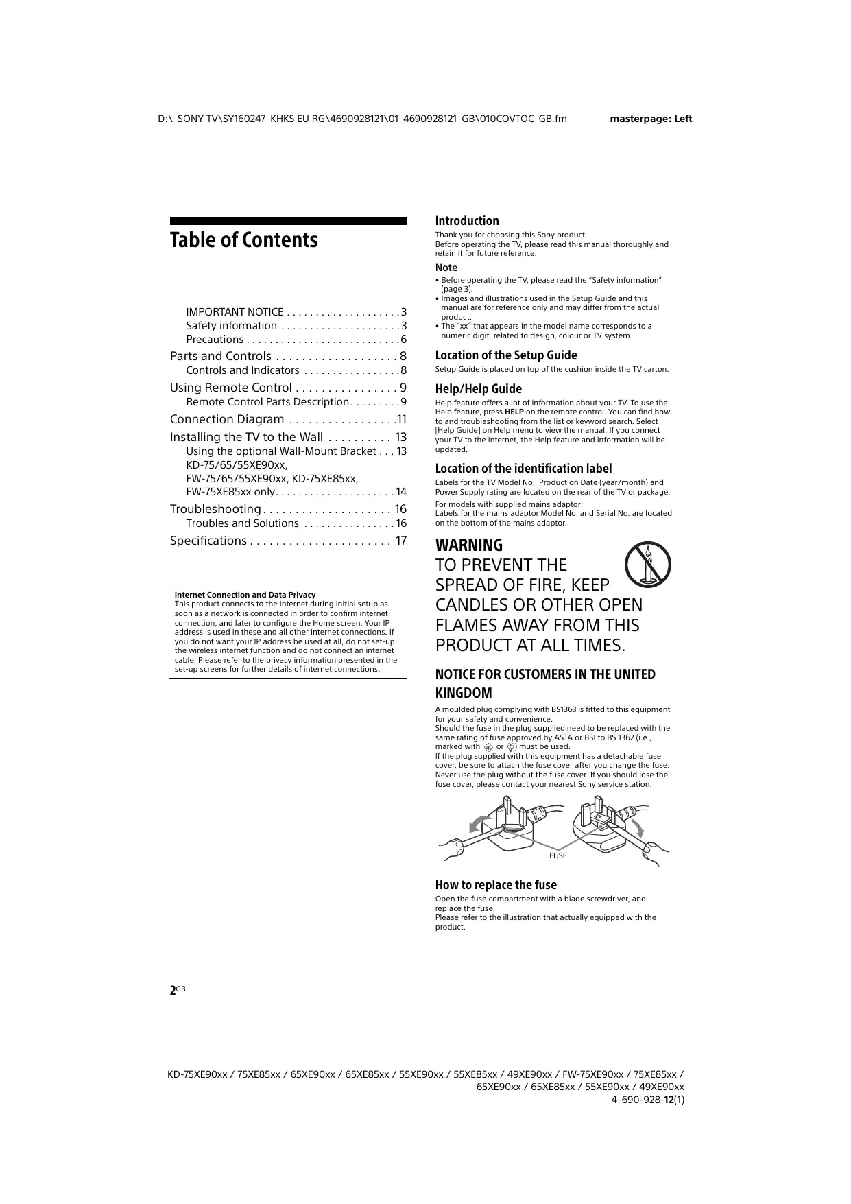 D:\_SONY TV\SY160247_KHKS EU RG\4690928121\01_4690928121_GB\010COVTOC_GB.fm masterpage: Left Introduction Table of Contents Thank you for choosing this Sony product. Before operating the TV, please read this manual thoroughly and retain it for future reference. Note Internet Connection and Data Privacy This product connects to the internet during initial setup as soon as a network is connected in order to confirm internet connection, and later to configure the Home screen. Your IP address is used in these and all other internet connections. If you do not want your IP address be used at all, do not set-up the wireless internet function and do not connect an internet cable. Please refer to the privacy information presented in the set-up screens for further details of internet connections.