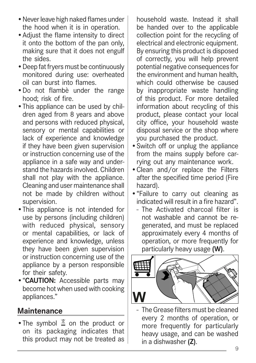 •Adjust the flame intensity to direct collection point for the recycling of it onto the bottom of the pan only, electrical and electronic equipment. making sure that it does not engulf By ensuring this product is disposed the sides. of correctly, you will help prevent •Deep fat fryers must be continuously potential negative consequences for monitored during use: overheated the environment and human health, oil can burst into flames. which could otherwise be caused •Do not flambè under the range by inappropriate waste handling hood; risk of fire. of this product. For more detailed •This appliance can be used by chilinformation about recycling of this dren aged from 8 years and above product, please contact your local and persons with reduced physical, city office, your household waste sensory or mental capabilities or disposal service or the shop where lack of experience and knowledge you purchased the product. if they have been given supervision •Switch off or unplug the appliance or instruction concerning use of the from the mains supply before carappliance in a safe way and underrying out any maintenance work. stand the hazards involved. Children •Clean and/or replace the Filters shall not play with the appliance. after the specified time period (Fire Cleaning and user maintenance shall hazard). not be made by children without •“Failure to carry out cleaning as supervision. indicated will result in a fire hazard”. •This appliance is not intended for -- The Activated charcoal filter is use by persons (including children) not washable and cannot be rewith reduced physical, sensory generated, and must be replaced or mental capabilities, or lack of approximately every 4 months of experience and knowledge, unless operation, or more frequently for they have been given supervision particularly heavy usage (W). or instruction concerning use of the appliance by a person responsible for their safety. •“CAUTION: Accessible parts may become hot when used with cooking appliances.”