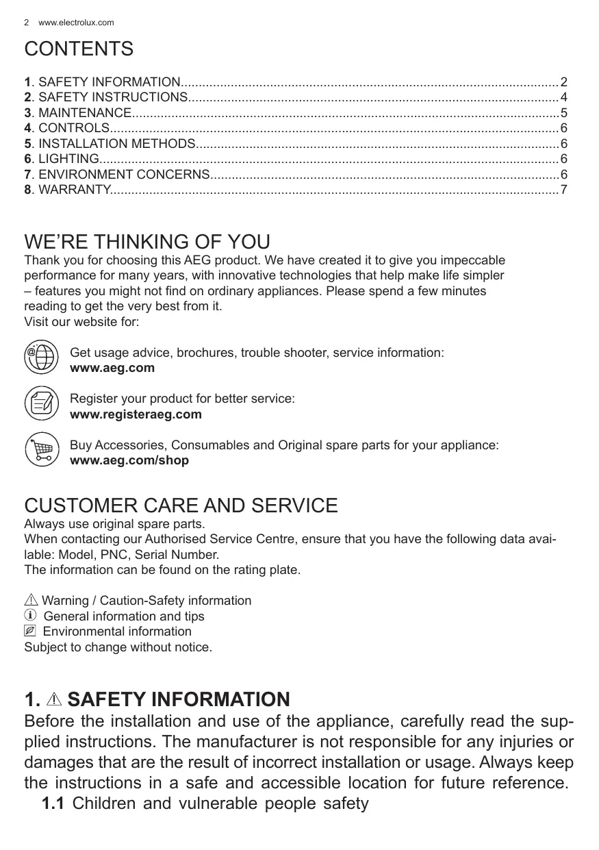 WE’RE THINKING OF YOU Thank you for choosing this AEG product. We have created it to give you impeccable performance for many years, with innovative technologies that help make life simpler