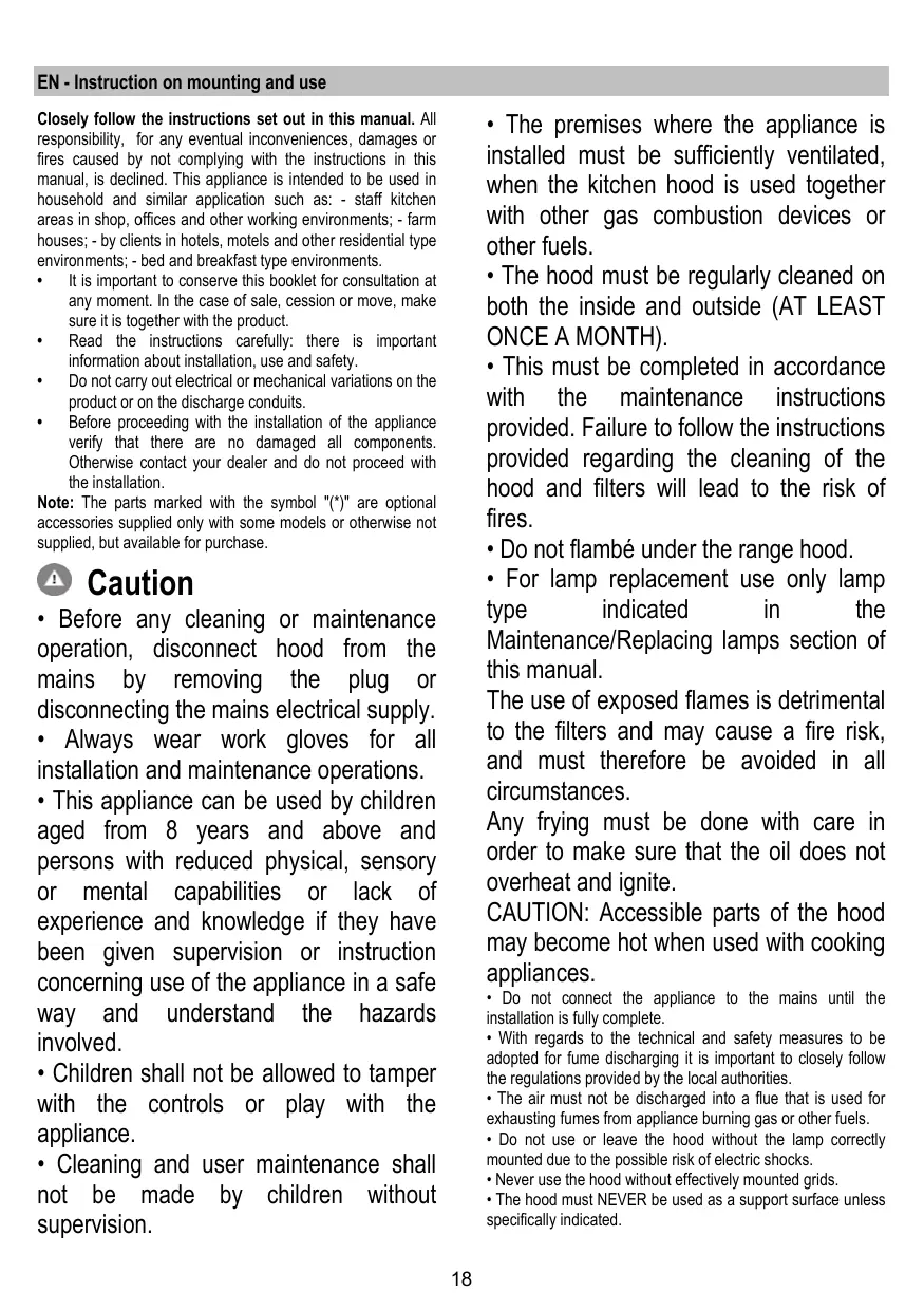 EN - Instruction on mounting and use Closely follow the instructions set out in this manual. All responsibility, for any eventual inconveniences, damages or fires caused by not complying with the instructions in this manual, is declined. This appliance is intended to be used in household and similar application such as: - staff kitchen areas in shop, offices and other working environments; - farm houses; - by clients in hotels, motels and other residential type environments; - bed and breakfast type environments. • It is important to conserve this booklet for consultation at any moment. In the case of sale, cession or move, make sure it is together with the product. • Read the instructions carefully: there is important information about installation, use and safety. • Do not carry out electrical or mechanical variations on the product or on the discharge conduits. • Before proceeding with the installation of the appliance verify that there are no damaged all components. Otherwise contact your dealer and do not proceed with the installation. Note: The parts marked with the symbol "(*)" are optional accessories supplied only with some models or otherwise not supplied, but available for purchase.
