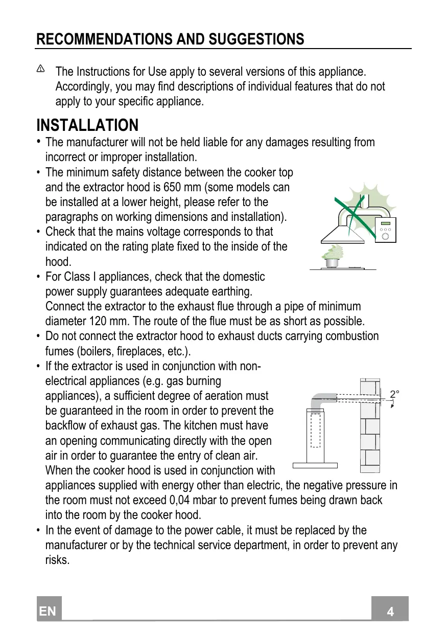 incorrect or improper installation. The minimum safety distance between the cooker top and the extractor hood is 650 mm (some models can be installed at a lower height, please refer to the paragraphs on working dimensions and installation). Check that the mains voltage corresponds to that indicated on the rating plate fixed to the inside of the hood. For Class I appliances, check that the domestic power supply guarantees adequate earthing. Connect the extractor to the exhaust flue through a pipe of minimum diameter 120 mm. The route of the flue must be as short as possible. Do not connect the extractor hood to exhaust ducts carrying combustion fumes (boilers, fireplaces, etc.). If the extractor is used in conjunction with nonelectrical appliances (e.g. gas burning appliances), a sufficient degree of aeration must be guaranteed in the room in order to prevent the backflow of exhaust gas. The kitchen must have an opening communicating directly with the open air in order to guarantee the entry of clean air. When the cooker hood is used in conjunction with appliances supplied with energy other than electric, the negative pressure in the room must not exceed 0,04 mbar to prevent fumes being drawn back into the room by the cooker hood. In the event of damage to the power cable, it must be replaced by the manufacturer or by the technical service department, in order to prevent any risks.