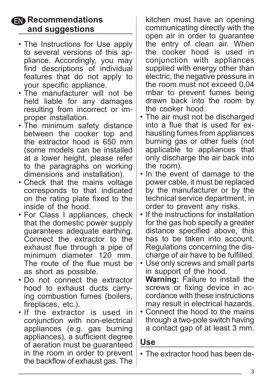 • The Instructions for Use apply to several versions of this appliance. Accordingly, you may find descriptions of individual features that do not apply to your specific appliance. • The manufacturer will not be held liable for any damages resulting from incorrect or improper installation. • The minimum safety distance between the cooker top and the extractor hood is 650 mm (some models can be installed at a lower height, please refer to the paragraphs on working dimensions and installation). • Check that the mains voltage corresponds to that indicated on the rating plate fixed to the inside of the hood. • For Class I appliances, check that the domestic power supply guarantees adequate earthing. Connect the extractor to the exhaust flue through a pipe of minimum diameter 120 mm. The route of the flue must be as short as possible. • Do not connect the extractor hood to exhaust ducts carrying combustion fumes (boilers, fireplaces, etc.). • If the extractor is used in conjunction with non-electrical appliances (e.g. gas burning appliances), a sufficient degree of aeration must be guaranteed in the room in order to prevent the backflow of exhaust gas. The