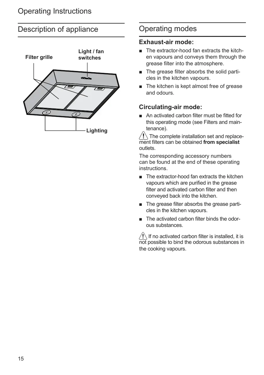 The complete installation set and replacement filters can be obtained from specialist outlets. The corresponding accessory numbers can be found at the end of these operating instructions. ■ The extractor-hood fan extracts the kitchen vapours which are purified in the grease filter and activated carbon filter and then conveyed back into the kitchen. ■ The grease filter absorbs the grease particles in the kitchen vapours. ■ The activated carbon filter binds the odorous substances. If no activated carbon filter is installed, it is not possible to bind the odorous substances in the cooking vapours.