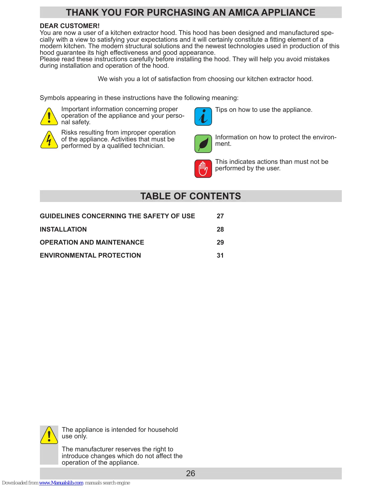 - Cooker hood is designed to remove cooking odours. Do not use cooker hood for other purposes.