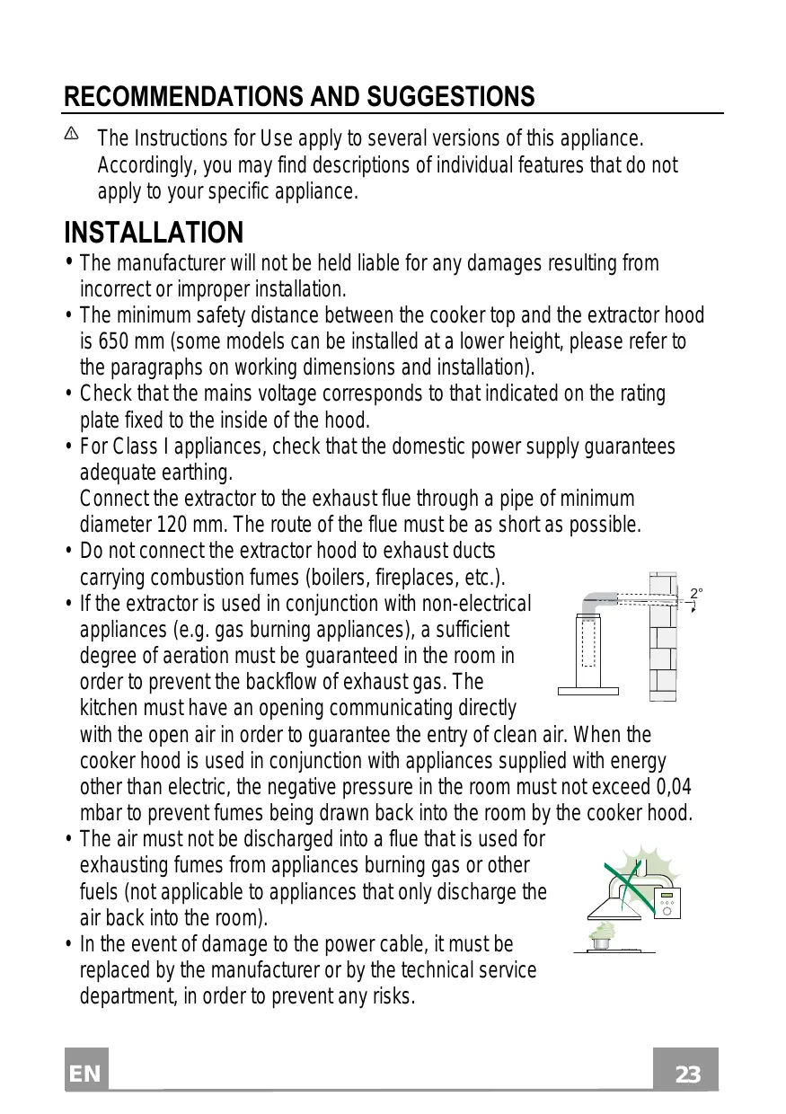 incorrect or improper installation. The minimum safety distance between the cooker top and the extractor hood is 650 mm (some models can be installed at a lower height, please refer to the paragraphs on working dimensions and installation). Check that the mains voltage corresponds to that indicated on the rating plate fixed to the inside of the hood. For Class I appliances, check that the domestic power supply guarantees adequate earthing. Connect the extractor to the exhaust flue through a pipe of minimum diameter 120 mm. The route of the flue must be as short as possible. Do not connect the extractor hood to exhaust ducts carrying combustion fumes (boilers, fireplaces, etc.). If the extractor is used in conjunction with non-electrical appliances (e.g. gas burning appliances), a sufficient degree of aeration must be guaranteed in the room in order to prevent the backflow of exhaust gas. The kitchen must have an opening communicating directly with the open air in order to guarantee the entry of clean air. When the cooker hood is used in conjunction with appliances supplied with energy other than electric, the negative pressure in the room must not exceed 0,04 mbar to prevent fumes being drawn back into the room by the cooker hood. The air must not be discharged into a flue that is used for exhausting fumes from appliances burning gas or other fuels (not applicable to appliances that only discharge the air back into the room). In the event of damage to the power cable, it must be replaced by the manufacturer or by the technical service department, in order to prevent any risks.