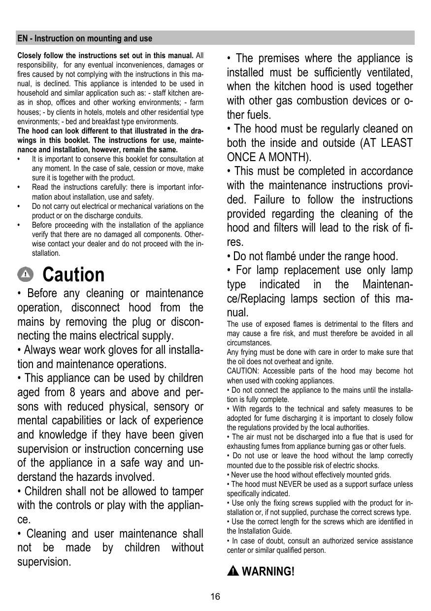 EN - Instruction on mounting and use Closely follow the instructions set out in this manual. All responsibility, for any eventual inconveniences, damages or fires caused by not complying with the instructions in this manual, is declined. This appliance is intended to be used in household and similar application such as: - staff kitchen areas in shop, offices and other working environments; - farm houses; - by clients in hotels, motels and other residential type environments; - bed and breakfast type environments. The hood can look different to that illustrated in the drawings in this booklet. The instructions for use, maintenance and installation, however, remain the same.