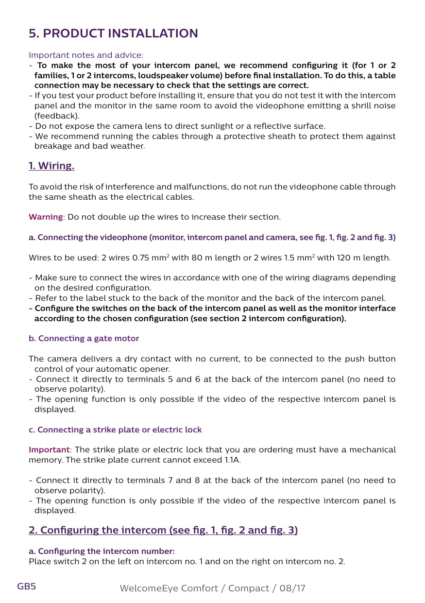 To avoid the risk of interference and malfunctions, do not run the videophone cable through the same sheath as the electrical cables. Warning: Do not double up the wires to increase their section. a. Connecting the videophone (monitor, intercom panel and camera, see fig. 1, fig. 2 and fig. 3) Wires to be used: 2 wires 0.75 mm2 with 80 m length or 2 wires 1.5 mm2 with 120 m length. - Make sure to connect the wires in accordance with one of the wiring diagrams depending on the desired configuration. - Refer to the label stuck to the back of the monitor and the back of the intercom panel. - Configure the switches on the back of the intercom panel as well as the monitor interface according to the chosen configuration (see section 2 intercom configuration). b. Connecting a gate motor The camera delivers a dry contact with no current, to be connected to the push button control of your automatic opener. - Connect it directly to terminals 5 and 6 at the back of the intercom panel (no need to observe polarity). - The opening function is only possible if the video of the respective intercom panel is displayed. c. Connecting a strike plate or electric lock Important: The strike plate or electric lock that you are ordering must have a mechanical memory. The strike plate current cannot exceed 1.1A. - Connect it directly to terminals 7 and 8 at the back of the intercom panel (no need to observe polarity). - The opening function is only possible if the video of the respective intercom panel is displayed.