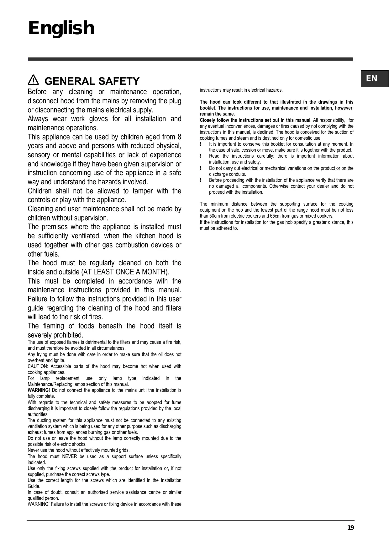 À GENERAL SAFETY Before any cleaning or maintenance operation, disconnect hood from the mains by removing the plug or disconnecting the mains electrical supply.