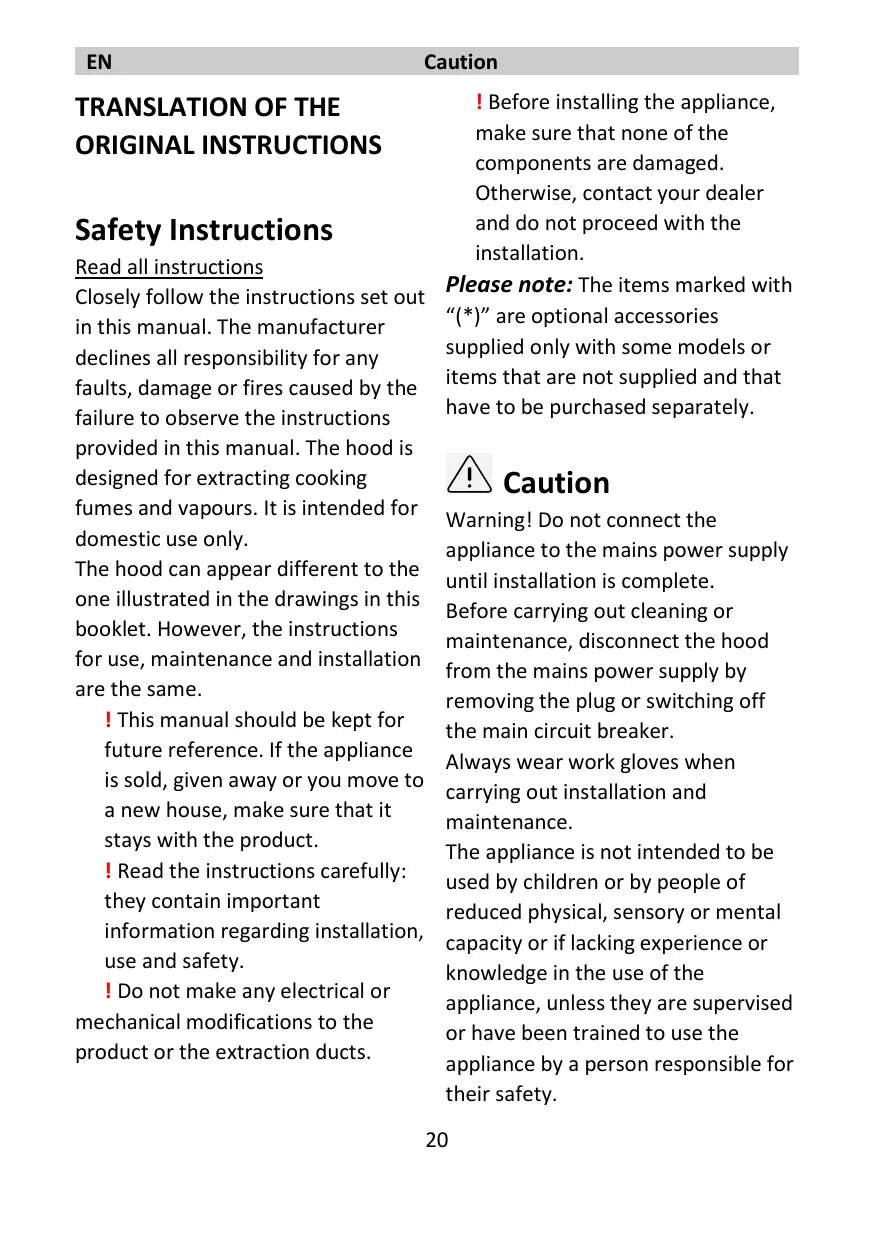 ! Before installing the appliance, make sure that none of the components are damaged. Otherwise, contact your dealer and do not proceed with the Safety Instructions installation. Read all instructions Please note: The items marked with Closely follow the instructions set out “(*)” are optional accessories in this manual. The manufacturer supplied only with some models or declines all responsibility for any faults, damage or fires caused by the items that are not supplied and that have to be purchased separately. failure to observe the instructions provided in this manual. The hood is designed for extracting cooking Caution fumes and vapours. It is intended for Warning! Do not connect the domestic use only. appliance to the mains power supply The hood can appear different to the until installation is complete. one illustrated in the drawings in this Before carrying out cleaning or booklet. However, the instructions maintenance, disconnect the hood for use, maintenance and installation from the mains power supply by are the same. removing the plug or switching off ! This manual should be kept for the main circuit breaker. future reference. If the appliance Always wear work gloves when is sold, given away or you move to carrying out installation and a new house, make sure that it maintenance. stays with the product. The appliance is not intended to be ! Read the instructions carefully: used by children or by people of they contain important reduced physical, sensory or mental information regarding installation, capacity or if lacking experience or use and safety. knowledge in the use of the ! Do not make any electrical or appliance, unless they are supervised mechanical modifications to the or have been trained to use the product or the extraction ducts. appliance by a person responsible for their safety.