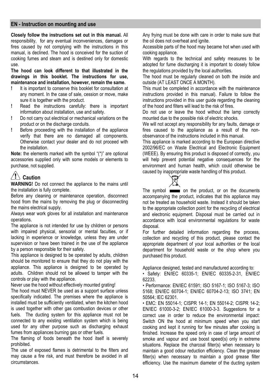 Performance: EN/IEC 61591; ISO 5167-1; ISO 5167-3; ISO 5168; EN/IEC 60704-1; EN/IEC 60704-2-13; ISO 3741; EN 50564; IEC 62301. - EMC: EN 55014-1; CISPR 14-1; EN 55014-2; CISPR 14-2; EN/IEC 61000-3-2; EN/IEC 61000-3-3. Suggestions for a correct use in order to reduce the environmental impact: Switch ON the hood at minimum speed when you start cooking and kept it running for few minutes after cooking is finished. Increase the speed only in case of large amount of smoke and vapour and use boost speed(s) only in extreme situations. Replace the charcoal filter(s) when necessary to maintain a good odour reduction efficiency. Clean the grease filter(s) when necessary to maintain a good grease filter efficiency. Use the maximum diameter of the ducting system