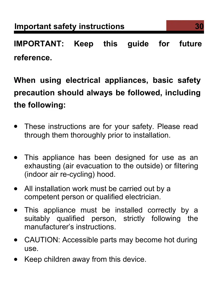 Afin de faire fonctionner l’appareil correctement et de manière sécurisée, lisez ce guide d’utilisation attentivement avant d’installer et d’utiliser le produit. Table des matières Trouver des informations 2 Instructions de sécurité importantes . 3 Lampe 9 Description du produit 10 Description des pièces 11 Installation de la hotte 12 Installation (Mode extraction) 12 Installation (Mode recyclage)14 Recommandations pour la fixation murale 15 Préparation avant installation 16 Fonctions du panneau de contrôle23 Dépannage 24 Informations techniques 25  Ces instructions sont fournies dans l’intérêt de votre sécurité, lisez-les soigneusement avant d’installer ou d’utiliser cet appareil.  Cet appareil a été conçu pour être utilisé comme une hotte aspirante (l’évacuation de l’air à l’extérieur) ou une hotte filtrante (le recyclage de l’air à l’intérieur).  Tous les travaux d’installation doivent être effectués par une personne compétente ou un électricien qualifié.  Cet appareil doit être installé correctement par un personnel qualifié, en suivant strictement les instructions du fabricant.  MISE EN GARDE: Les surfaces accessibles peuvent devenir chaudes pendant l’utilisation.