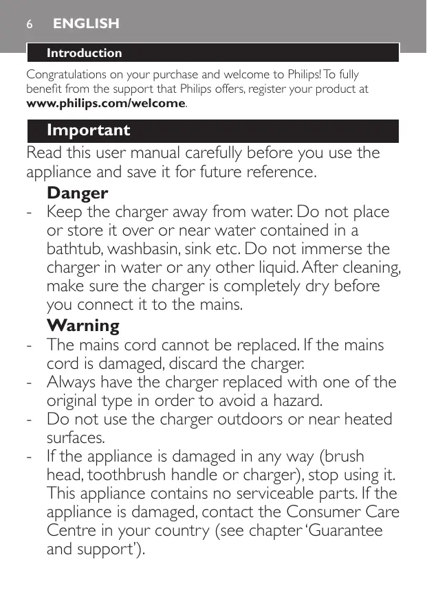 Read this user manual carefully before you use the appliance and save it for future reference. Danger -- Keep the charger away from water. Do not place or store it over or near water contained in a bathtub, washbasin, sink etc. Do not immerse the charger in water or any other liquid. After cleaning, make sure the charger is completely dry before you connect it to the mains. Warning -- The mains cord cannot be replaced. If the mains cord is damaged, discard the charger. -- Always have the charger replaced with one of the original type in order to avoid a hazard. -- Do not use the charger outdoors or near heated surfaces. -- If the appliance is damaged in any way (brush head, toothbrush handle or charger), stop using it. This appliance contains no serviceable parts. If the appliance is damaged, contact the Consumer Care Centre in your country (see chapter ‘Guarantee and support’).