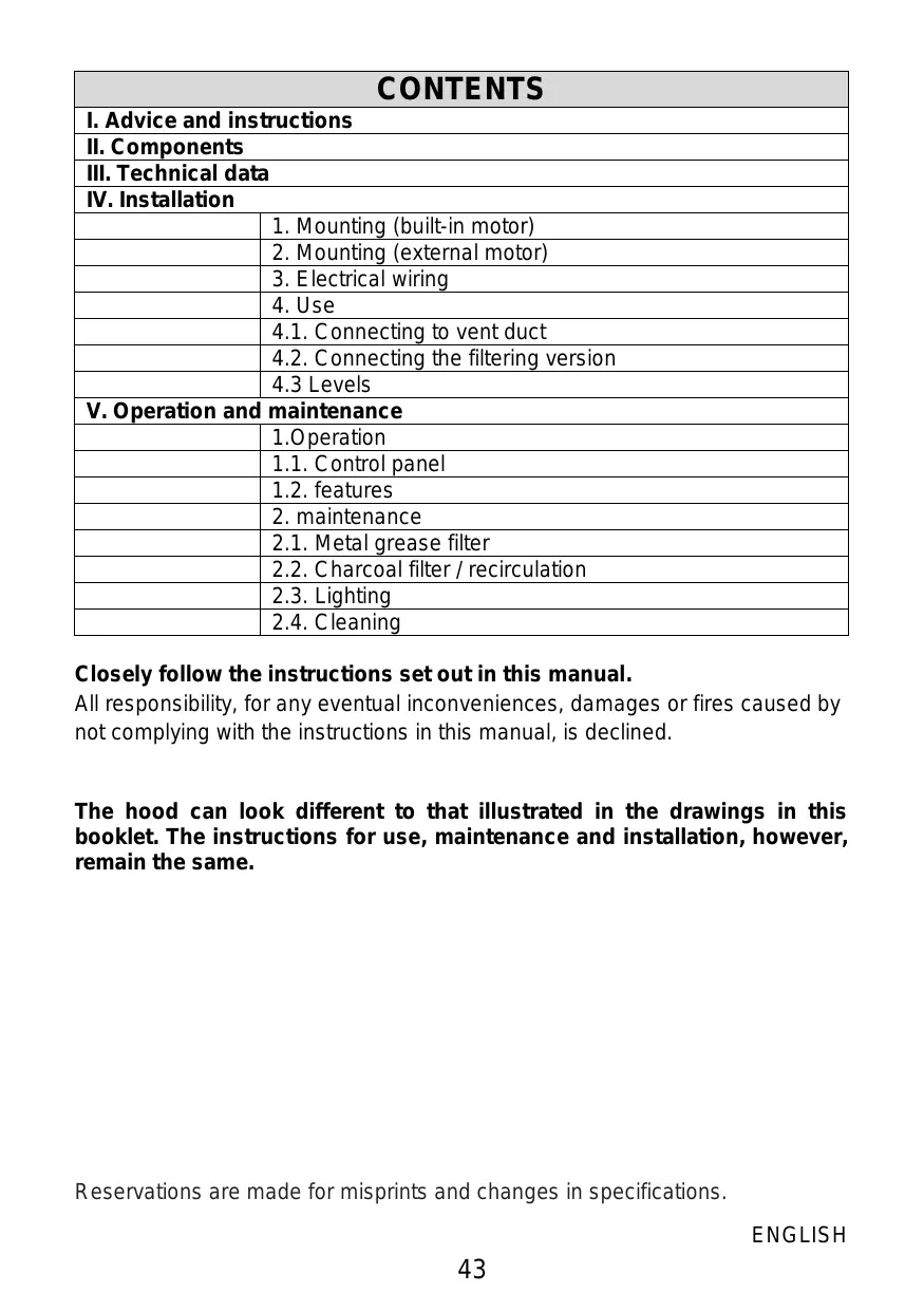 The hood can look different to that illustrated in the drawings in this booklet. The instructions for use, maintenance and installation, however, remain the same.