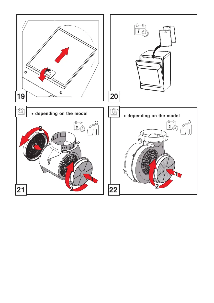 • Enlevez le(s) filtre(s) à charbon actif (*) s'ils sont fournis (voir également le chapitre "Entretien"). Il faudra les remettre en place uniquement si l'on utilise la hotte en mode recyclage.