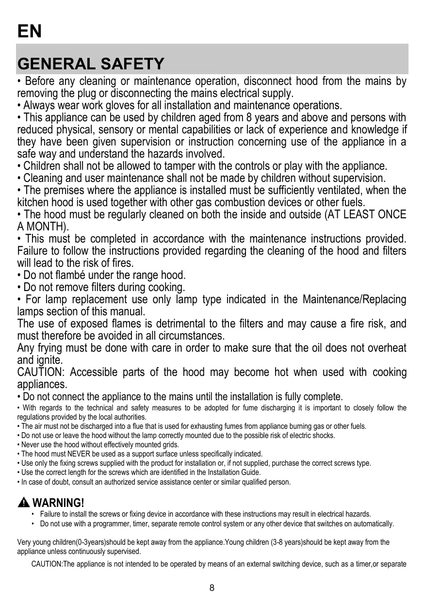 EN GENERAL SAFETY • Before any cleaning or maintenance operation, disconnect hood from the mains by removing the plug or disconnecting the mains electrical supply. • Always wear work gloves for all installation and maintenance operations. • This appliance can be used by children aged from 8 years and above and persons with reduced physical, sensory or mental capabilities or lack of experience and knowledge if they have been given supervision or instruction concerning use of the appliance in a safe way and understand the hazards involved. • Children shall not be allowed to tamper with the controls or play with the appliance. • Cleaning and user maintenance shall not be made by children without supervision. • The premises where the appliance is installed must be sufficiently ventilated, when the kitchen hood is used together with other gas combustion devices or other fuels. • The hood must be regularly cleaned on both the inside and outside (AT LEAST ONCE A MONTH). • This must be completed in accordance with the maintenance instructions provided. Failure to follow the instructions provided regarding the cleaning of the hood and filters will lead to the risk of fires. • Do not flambé under the range hood. • Do not remove filters during cooking. • For lamp replacement use only lamp type indicated in the Maintenance/Replacing lamps section of this manual. The use of exposed flames is detrimental to the filters and may cause a fire risk, and must therefore be avoided in all circumstances. Any frying must be done with care in order to make sure that the oil does not overheat and ignite. CAUTION: Accessible parts of the hood may become hot when used with cooking appliances. • Do not connect the appliance to the mains until the installation is fully complete.