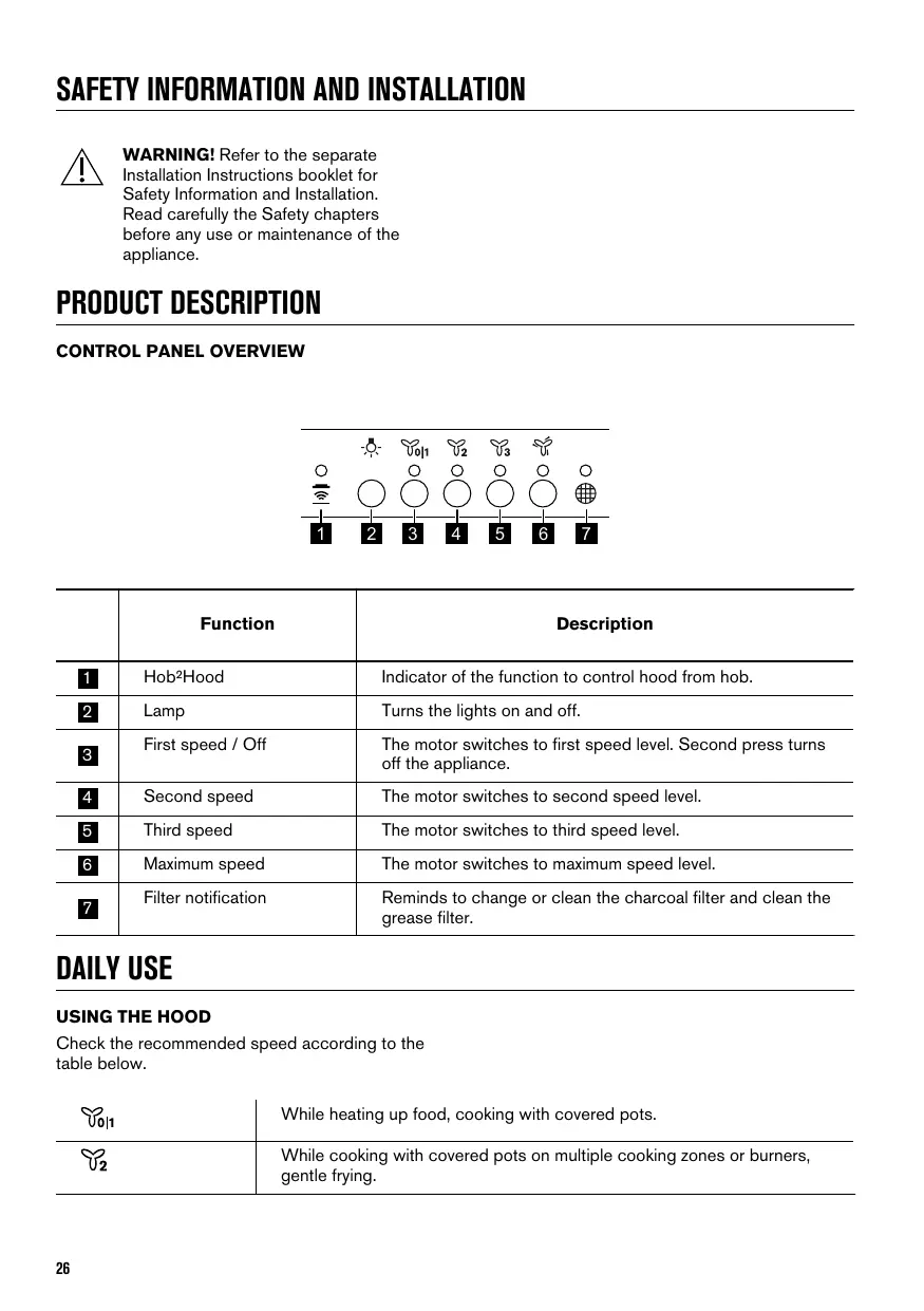 DAILY USE USING THE HOOD Check the recommended speed according to the table below.