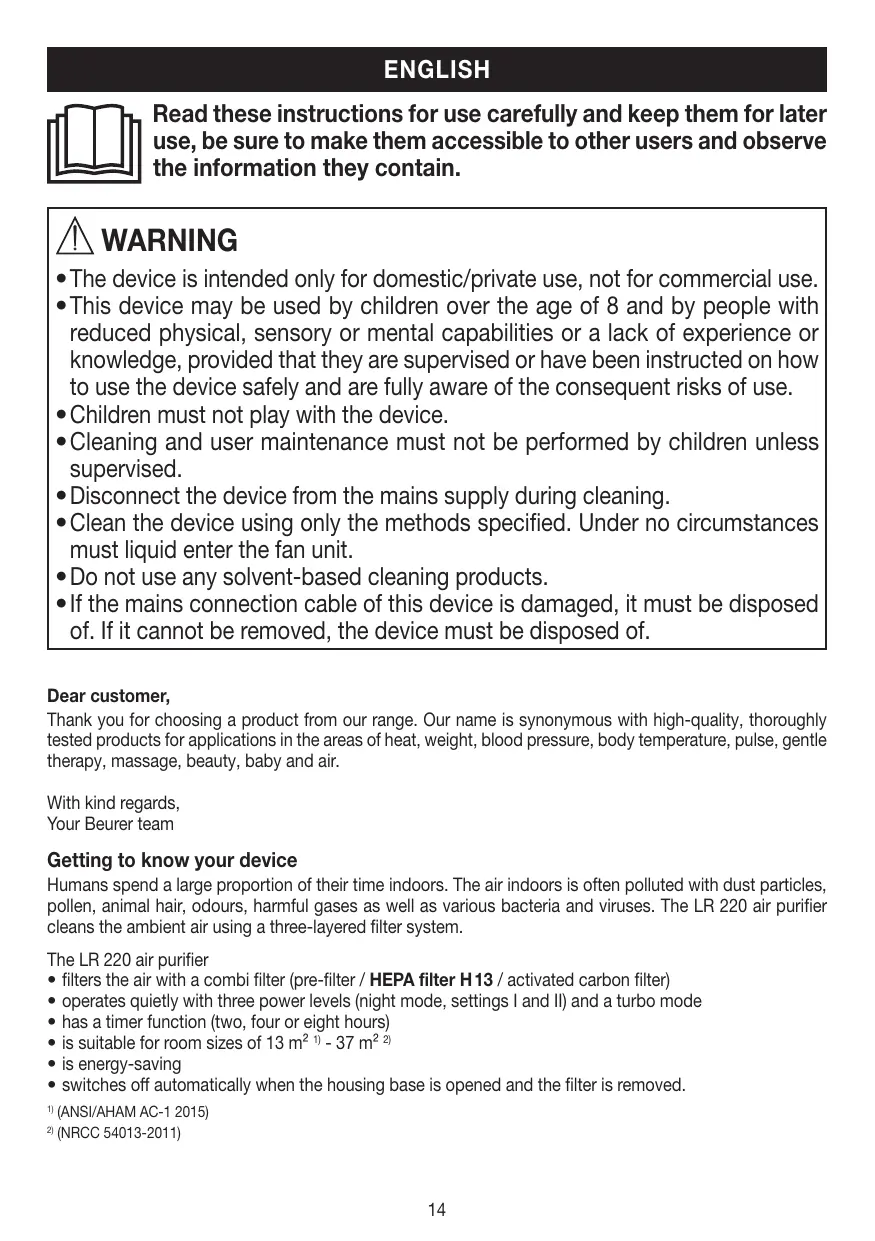 - If the mains connection cable of this device is damaged, it must be disposed of. If it cannot be removed, the device must be disposed of. Dear customer, Thank you for choosing a product from our range. Our name is synonymous with high-quality, thoroughly tested products for applications in the areas of heat, weight, blood pressure, body temperature, pulse, gentle therapy, massage, beauty, baby and air. With kind regards, Your Beurer team Getting to know your device Humans spend a large proportion of their time indoors. The air indoors is often polluted with dust particles, pollen, animal hair, odours, harmful gases as well as various bacteria and viruses. The LR 220 air purifier cleans the ambient air using a three-layered filter system. The LR 220 air purifier