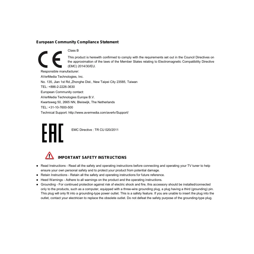 Quick Guide European Community Compliance Statement Class B This product is herewith confirmed to comply with the requirements set out in the Council Directives on the approximation of the laws of the Member States relating to Electromagnetic Compatibility Directive (EMC) 2014/30/EU. Responsible manufacturer: AVerMedia Technologies, Inc. No. 135, Jian 1st Rd.,Zhonghe Dist., New Taipei City 23585, Taiwan