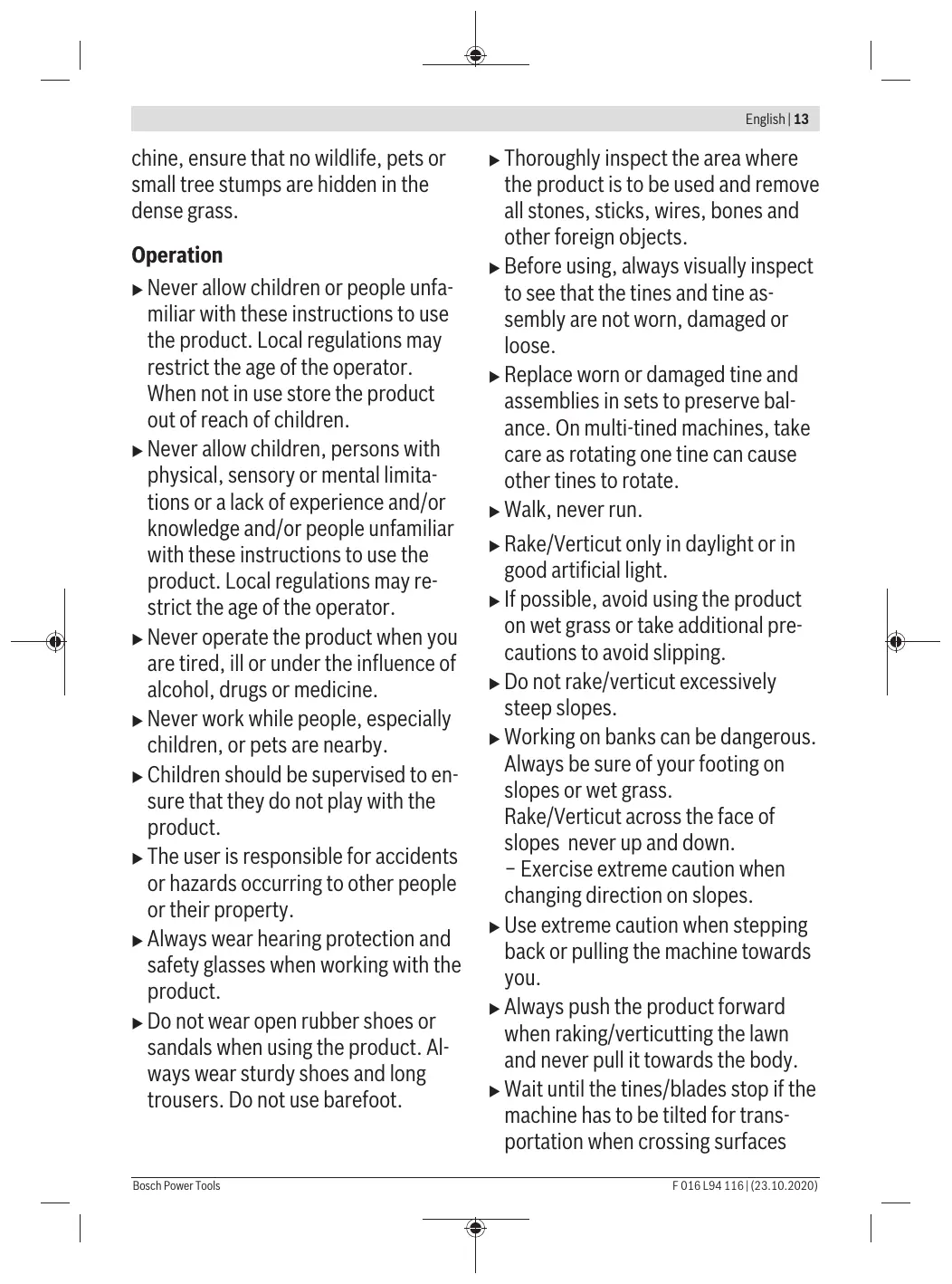 Switch off and remove plug from mains before adjusting, cleaning or if the cable is entangled and before leaving the garden tool unattended for any period. Keep the power cord away from the raking tines/blades. Wait until all machine components have completely stopped before touching them. The tines/blades continue to rotate after the machine is switched off, a rotating blade can cause injury. Do not use the product in the rain or leave it outdoors when it is raining. Beware electric shock hazard. Keep supply flexible cord away from cutting means. Do not use a high-pressure washer or a garden hose to clean the machine. Carefully check the area where the tool is to be used for wildlife and pets. Wildlife and pets may be injured while the machine is in operation. Thoroughly check the working area and remove any stones, sticks, wires, bones and foreign objects. When using the maBosch Power Tools