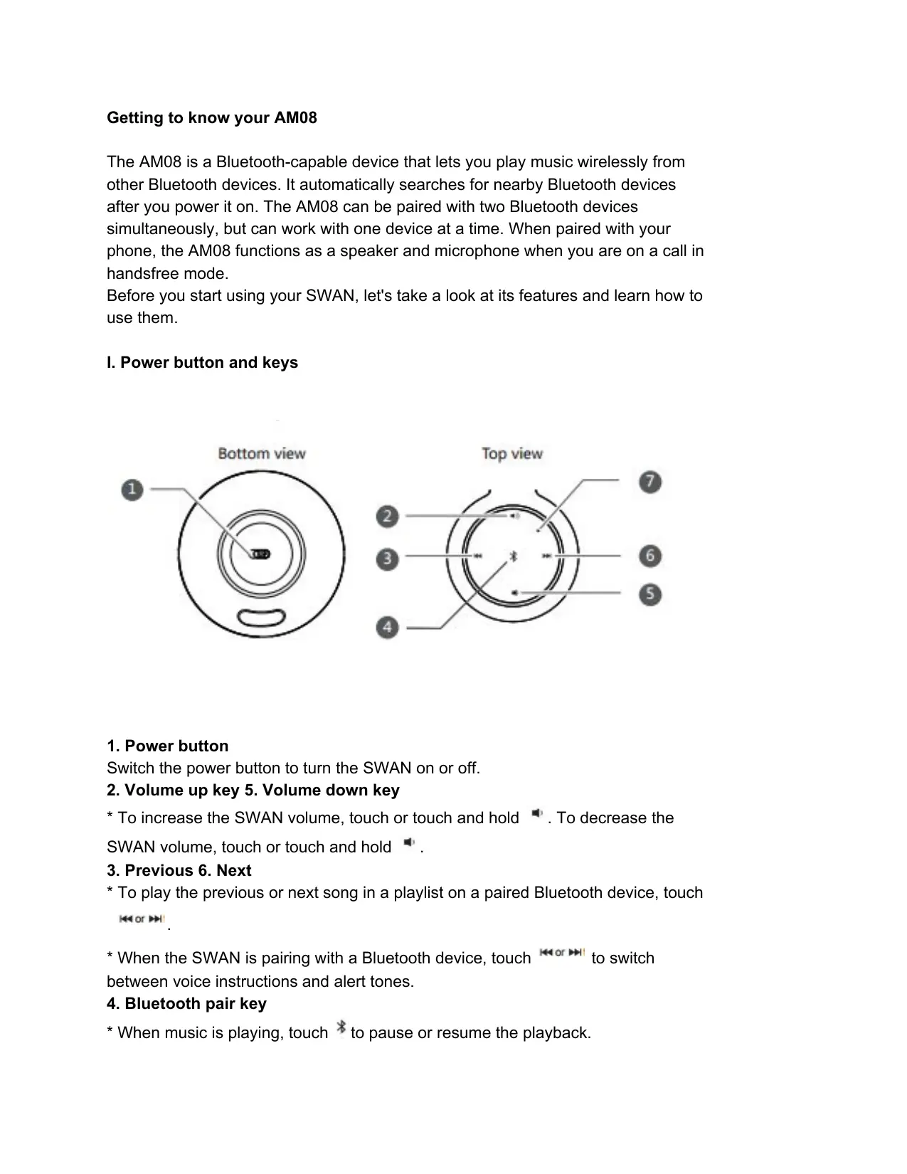 Getting to know your AM08 The AM08 is a Bluetoothcapable device that lets you play music wirelessly from other Bluetooth devices. It automatically searches for nearby Bluetooth devices after you power it on. The AM08 can be paired with two Bluetooth devices simultaneously, but can work with one device at a time. When paired with your phone, the AM08 functions as a speaker and microphone when you are on a call in handsfree mode. Before you start using your SWAN, let's take a look at its features and learn how to use them.