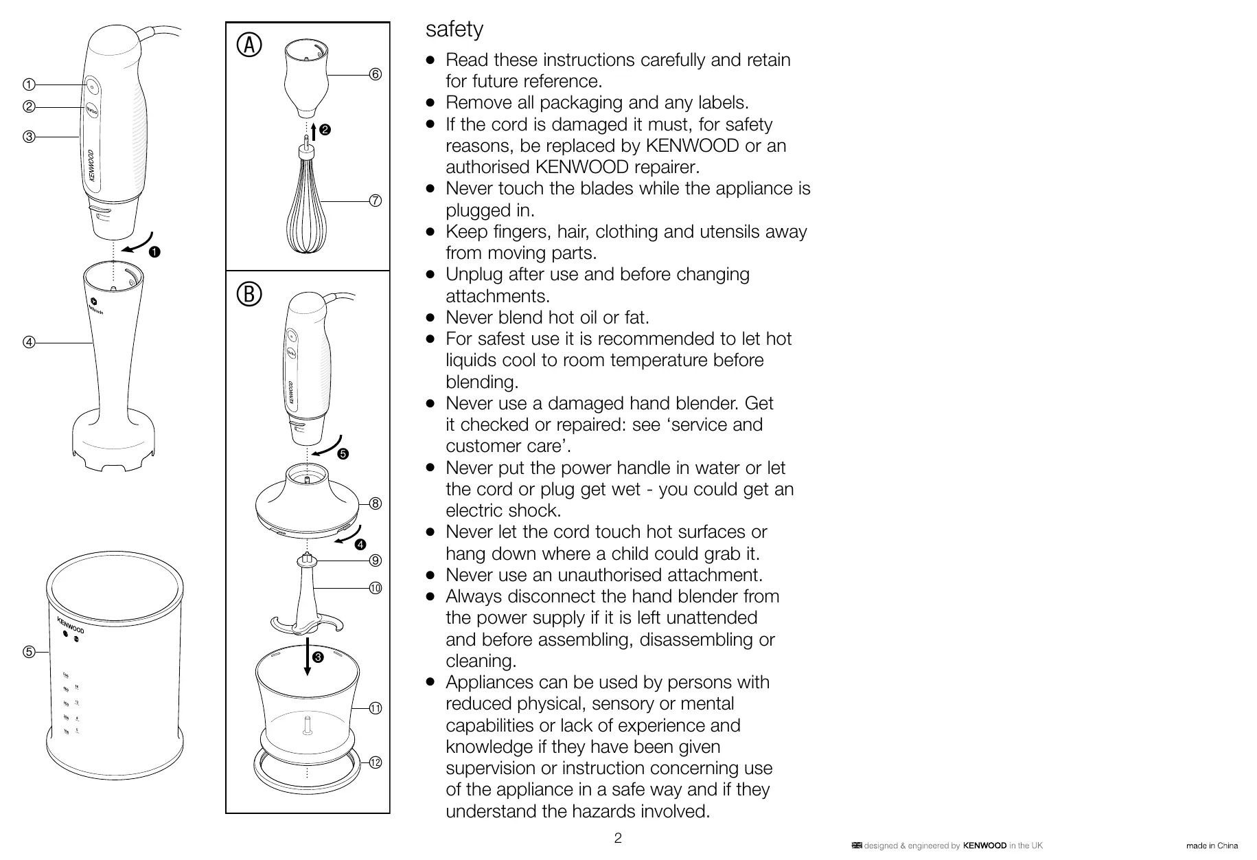 Remove all packaging and any labels. If the cord is damaged it must, for safety reasons, be replaced by KENWOOD or an authorised KENWOOD repairer. Never touch the blades while the appliance is plugged in. Keep fingers, hair, clothing and utensils away from moving parts. Unplug after use and before changing attachments. Never blend hot oil or fat. For safest use it is recommended to let hot liquids cool to room temperature before blending. Never use a damaged hand blender. Get it checked or repaired: see ‘service and customer care’. Never put the power handle in water or let the cord or plug get wet - you could get an electric shock. Never let the cord touch hot surfaces or hang down where a child could grab it. Never use an unauthorised attachment. Always disconnect the hand blender from the power supply if it is left unattended and before assembling, disassembling or cleaning. Appliances can be used by persons with reduced physical, sensory or mental capabilities or lack of experience and knowledge if they have been given supervision or instruction concerning use of the appliance in a safe way and if they understand the hazards involved. 2