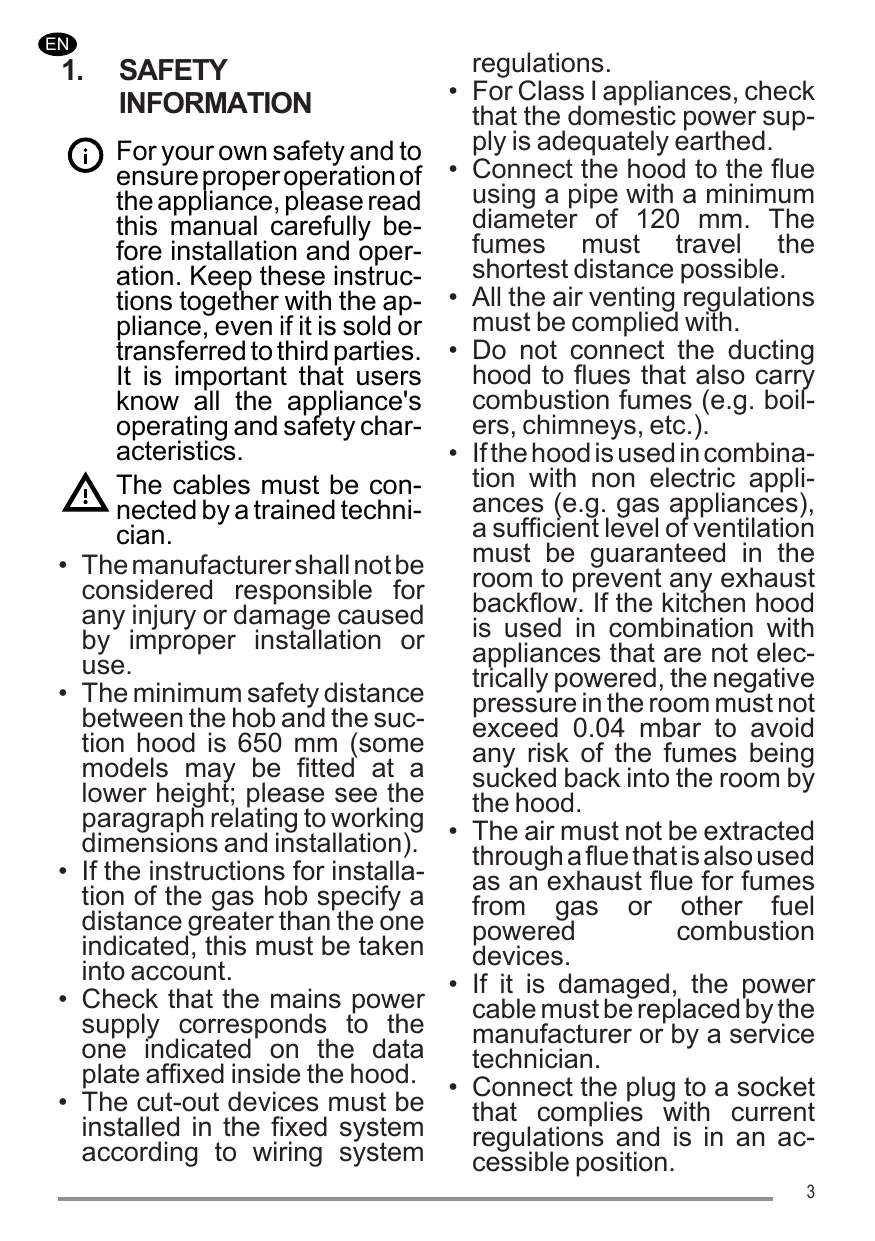 For your own safety and to ensure proper operation of the appliance, please read this manual carefully before installation and operation. Keep these instructions together with the appliance, even if it is sold or transferred to third parties. It is important that users know all the appliance's operating and safety characteristics. The cables must be connected by a trained technician. The manufacturer shall not be considered responsible for any injury or damage caused by improper installation or use. The minimum safety distance between the hob and the suction hood is 650 mm (some models may be fitted at a lower height; please see the paragraph relating to working dimensions and installation). If the instructions for installation of the gas hob specify a distance greater than the one indicated, this must be taken into account. Check that the mains power supply corresponds to the one indicated on the data plate affixed inside the hood. The cut-out devices must be installed in the fixed system according to wiring system