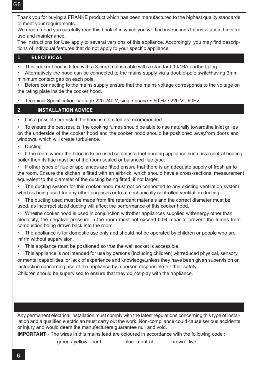 ELECTRICAL CONNECTION Before connecting to the mains supply ensure that the mains voltage corresponds to the voltage on the rating plate inside the cooker hood. This appliance is fitted with a 2 core mains cable and must be permanently connected to the electricity supply via a double-pole switch having 3mm minimum contact gap on each pole. A Switched Fuse Connection Unit to BS.1363 Part 4, fitted with a 3 Amp fuse, is a recommended mains supply connection accessory to ensure compliance with the Safety Requirements applicable to fixed wiring instructions.