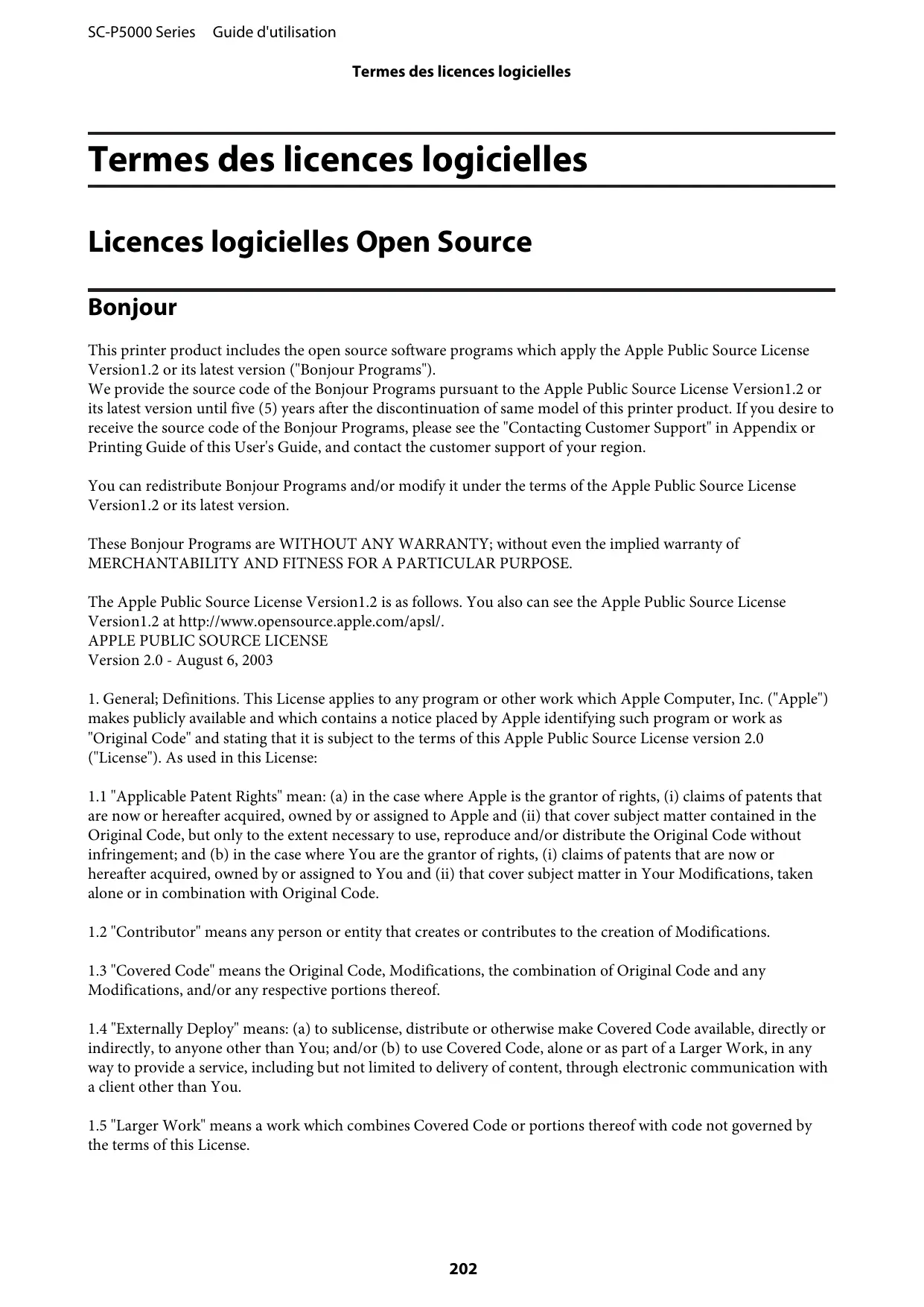 SC-P5000 Series Guide d'utilisation Termes des licences logicielles Termes des licences logicielles Licences logicielles Open Source Bonjour This printer product includes the open source software programs which apply the Apple Public Source License Version1.2 or its latest version ("Bonjour Programs"). We provide the source code of the Bonjour Programs pursuant to the Apple Public Source License Version1.2 or its latest version until five (5) years after the discontinuation of same model of this printer product. If you desire to receive the source code of the Bonjour Programs, please see the "Contacting Customer Support" in Appendix or Printing Guide of this User's Guide, and contact the customer support of your region. You can redistribute Bonjour Programs and/or modify it under the terms of the Apple Public Source License Version1.2 or its latest version. These Bonjour Programs are WITHOUT ANY WARRANTY; without even the implied warranty of MERCHANTABILITY AND FITNESS FOR A PARTICULAR PURPOSE. The Apple Public Source License Version1.2 is as follows. You also can see the Apple Public Source License Version1.2 at http://www.opensource.apple.com/apsl/.