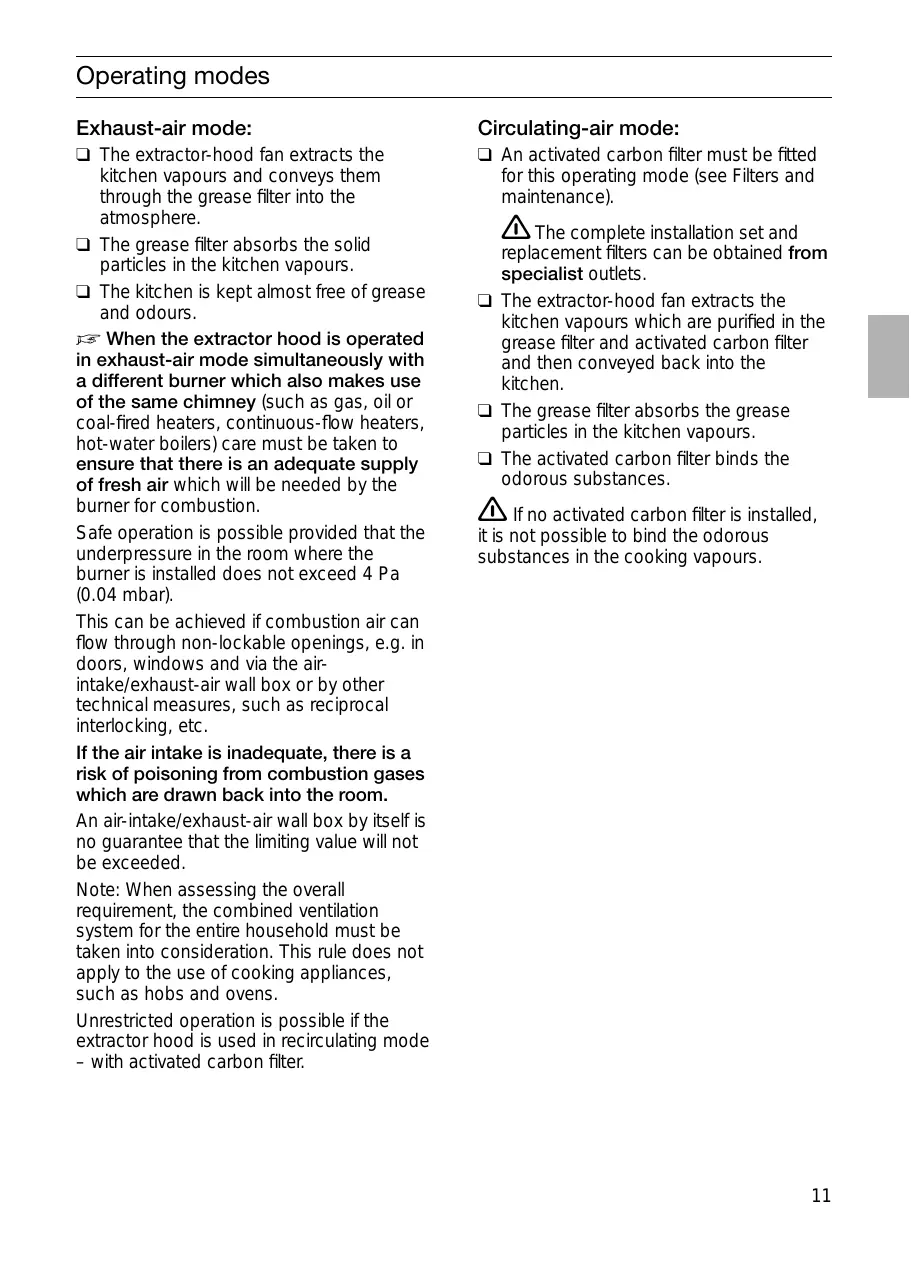 ❑ The grease filter absorbs the solid particles in the kitchen vapours. ❑ The kitchen is kept almost free of grease and odours. D When the extractor hood is operated in exhaust-air mode simultaneously with a different burner which also makes use of the same chimney (such as gas, oil or coal-fired heaters, continuous-flow heaters, hot-water boilers) care must be taken to ensure that there is an adequate supply of fresh air which will be needed by the burner for combustion. Safe operation is possible provided that the underpressure in the room where the burner is installed does not exceed 4 Pa (0.04 mbar). This can be achieved if combustion air can flow through non-lockable openings, e.g. in doors, windows and via the airintake/exhaust-air wall box or by other technical measures, such as reciprocal interlocking, etc. If the air intake is inadequate, there is a risk of poisoning from combustion gases which are drawn back into the room. An air-intake/exhaust-air wall box by itself is no guarantee that the limiting value will not be exceeded. Note: When assessing the overall requirement, the combined ventilation system for the entire household must be taken into consideration. This rule does not apply to the use of cooking appliances, such as hobs and ovens. Unrestricted operation is possible if the extractor hood is used in recirculating mode – with activated carbon filter.