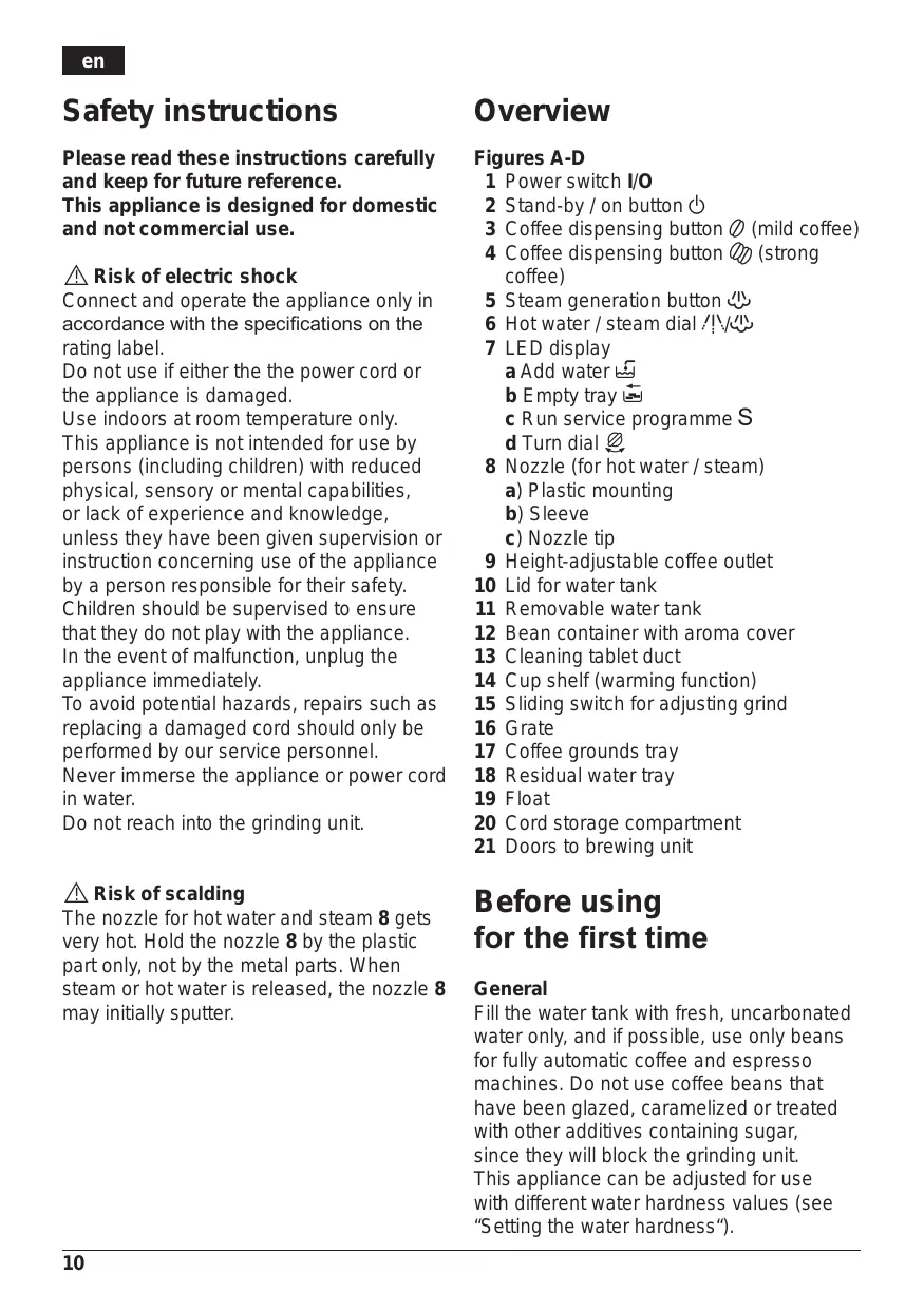 General Fill the water tank with fresh, uncarbonated water only, and if possible, use only beans for fully automatic coffee and espresso machines. Do not use coffee beans that have been glazed, caramelized or treated with other additives containing sugar, since they will block the grinding unit. This appliance can be adjusted for use with different water hardness values (see “Setting the water hardness“).