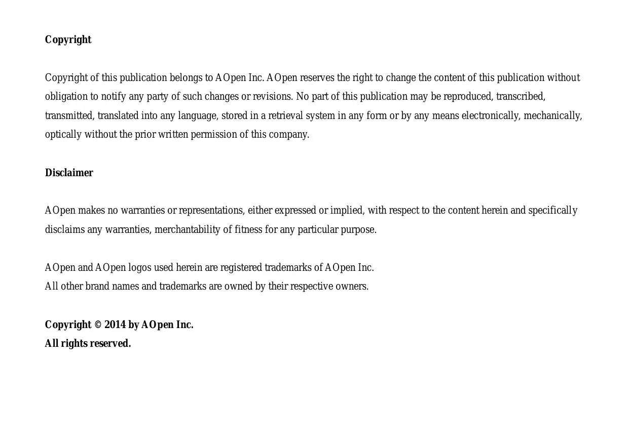 為了保護環境,請勿將本產品當作一般廢棄物處理。為減少環境污染,維護地球資源,本產品報廢時,請回收本產品。 Instruktion til bortskaffelse (Danish) Af hensyn til vores miljø bedes De ikke bortskaffe denne elektroniske enhed i en almindelig affaldsspand. For at mindske forurening og sikre beskyttelse af miljøet bedes De genbruge produktet. For yderligere information vedrørende indsamling og genbrug af elektronik-affald (Waste Electrical and Electronic Equipment (WEEE)) er De velkommen til at besøge vores website www.aopen.com og læ se næ rmere under "Green Products". Verwijderingsinstructie (Dutch) Om mogelijke schade aan het milieu of de menselijke gezondheid door ongecontroleerde afvalverwijdering te voorkomen, moet u dit elektronisch product scheiden van andere soorten afval en op een verantwoorde manier recyclen. Verwijder dit product dan ook alstublieft niet samen met ander huishoudelijk afval. Voor meer informatie over de verzameling en recycling van elektrisch afval en elektronische apparatuur (WEEE), nodigen we u uit om onze homepage te bezoeken www.aopen.com onder "Green Products". Instruction de Disposition (French) Pour une meilleure protection de la terre, ne jetez pas ce dispositif électronique dans la poubelle municipale lors de la disposition. Pour éliminer la pollution et assurer la plus grande protection de l'environnement global, réutilisez s’il vous plaît le produit. Pour plus d'informations sur la gestion des déchets d’Equipements Electriques et Electroniques (DEEE ou WEEE), vous êtes invité à visiter notre site à www.aopen.com sous " Green Products". Entsorgungsanleitung (German) Zum besseren Schutze unseres Planeten, schmeissen Sie elektrische Geräte bitte nicht in öffentliche Mülleimer. Zur Verringerung der Verschmutzung und zur Sicherstellung grösstmöglichen Schutzes der Umwelt recyceln Sie bitte das Produkt. Für mehr Informationen zum Sammeln und Recyceln von elektrischen und elektronischen Müll (WEEE) besuchen Sie bitte unsere Homepage unter www.aopen.com unter dem Punkt "Green Products". Istruzioni per lo smaltimento (Italian) Per una migliore salvaguardia del nostro pianeta, si prega di non gettare questo dispositivo elettronico nei normali rifiuti al momento dell'eliminazione. Per ridurre al minimo l'inquinamento ed assicurare la massima protezione dell'ambiente, si prega di riciclare il prodotto. Per maggiori informazioni riguardanti la raccolta ed il riciclaggio delle apparecchiature elettriche ed elettroniche residue (WEEE), siete invitati a visitare la nostra homepage www.aopen.com alla voce "Green Products". Instruksjoner for Resirkulering og Oppsamling (Norweigian) For ĺ beskytte vĺr planet, kast ikke dette elektroniske utstyret sammen med vanlig avfall. For ĺ beskytte vĺr natur og miljř, vennligst resirkuler dette produktet. For mer informasjon om oppsamling og resirkulering i henhold til Waste Electrical and Electronic Equipment (WEEE), se vĺr hjemmeside pĺ www.aopen.com under "Green Products". REEE - Programa de Tratamento de Resíduos de Equipamentos Eléctricos e Electrónicos (Portugese) Para melhor protecção ambiental do nosso planeta terra, não coloque o dispositivo electrónico no receptáculo de lixo municipal. Para minimizar a poluição e garantir protecção máxima do ambiente global, recicle o produto. Para mais informações sobre acerca da recolha e reciclagem de Equipamento Eléctrico e Electrónico (WEEE), convidamos-lhe a visitar nossa página na Internet em www.aopen.com sobre "Green Products". Instrucciones para depositar los productos electrónicos (Spanish) Para proteger mejor el medio ambiente, por favor, no deposite los productos electrónicos en los contenedores de basura tradicionales. Para reducir la contaminación y proteger el medio ambiente se recomienda que los recicle. Para más información acerca de dónde depositar y cómo reciclar Equipos Electrónicos y Desperdicios Electrónicos (WEEE), por favor, visite la página web www.aopen.com y entre en la sección Productos Ecológicos (“Green Products”). Kassering (Swedish) För att bättre värna om vår jord bör denna elektroniska utrustning ej kasseras tillsammans med vanligt avfall. För att minimera mängden föroreningar och så långt som möjligt skydda den globala miljön bör produkten återvinnas. För vidare information om insamling och återvinning av uttjänta elektriska och elektroniska produkter (Waste Electrical and Electronic Equipment, WEEE), besök avsnittet "Green Products" på vår hemsida, www.aopen.com. Copyright Copyright of this publication belongs to AOpen Inc. AOpen reserves the right to change the content of this publication without obligation to notify any party of such changes or revisions. No part of this publication may be reproduced, transcribed, transmitted, translated into any language, stored in a retrieval system in any form or by any means electronically, mechanically, optically without the prior written permission of this company. Disclaimer AOpen makes no warranties or representations, either expressed or implied, with respect to the content herein and specifically disclaims any warranties, merchantability of fitness for any particular purpose. AOpen and AOpen logos used herein are registered trademarks of AOpen Inc. All other brand names and trademarks are owned by their respective owners. Copyright © 2014 by AOpen Inc. All rights reserved. Safety Instructions
