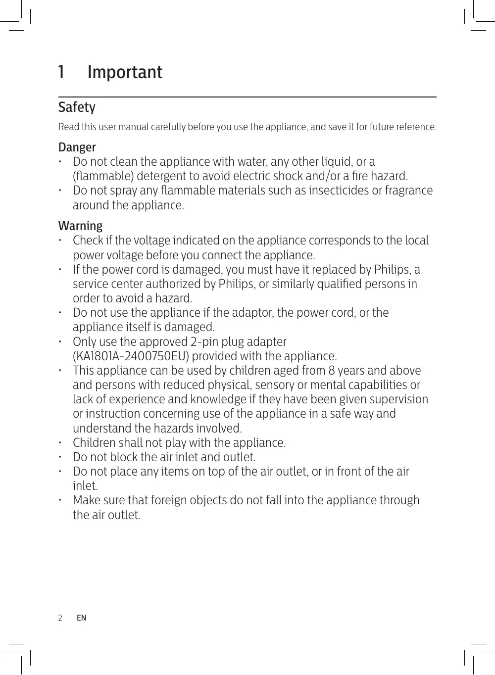 • Do not clean the appliance with water, any other liquid, or a (flammable) detergent to avoid electric shock and/or a fire hazard. • Do not spray any flammable materials such as insecticides or fragrance around the appliance. Warning • Check if the voltage indicated on the appliance corresponds to the local power voltage before you connect the appliance. • If the power cord is damaged, you must have it replaced by Philips, a service center authorized by Philips, or similarly qualified persons in order to avoid a hazard. • Do not use the appliance if the adaptor, the power cord, or the appliance itself is damaged. • Only use the approved 2-pin plug adapter (KA1801A-2400750EU) provided with the appliance. • This appliance can be used by children aged from 8 years and above and persons with reduced physical, sensory or mental capabilities or lack of experience and knowledge if they have been given supervision or instruction concerning use of the appliance in a safe way and understand the hazards involved. • Children shall not play with the appliance. • Do not block the air inlet and outlet. • Do not place any items on top of the air outlet, or in front of the air inlet. • Make sure that foreign objects do not fall into the appliance through the air outlet.
