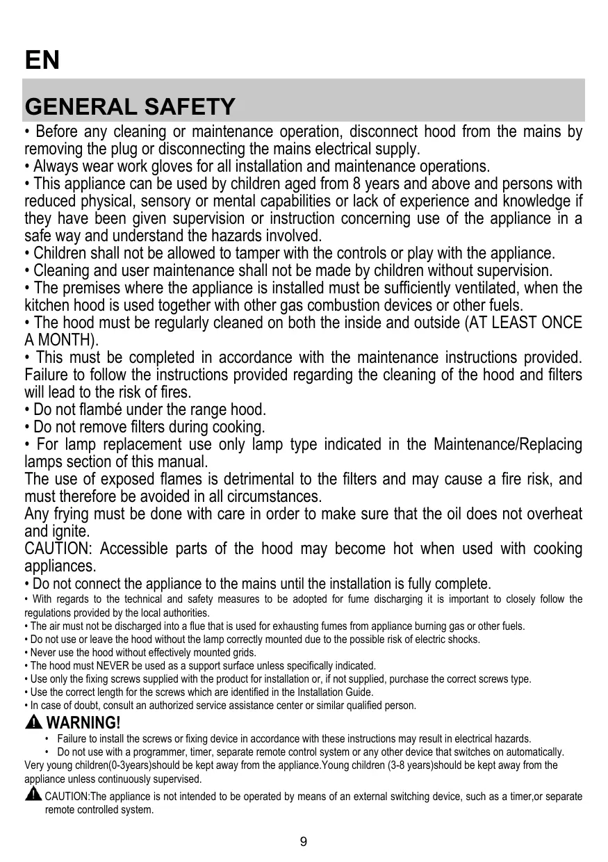 - For lamp replacement use only lamp type indicated in the Maintenance/Replacing lamps section of this manual. The use of exposed flames is detrimental to the filters and may cause a fire risk, and must therefore be avoided in all circumstances. Any frying must be done with care in order to make sure that the oil does not overheat and ignite. CAUTION: Accessible parts of the hood may become hot when used with cooking appliances.