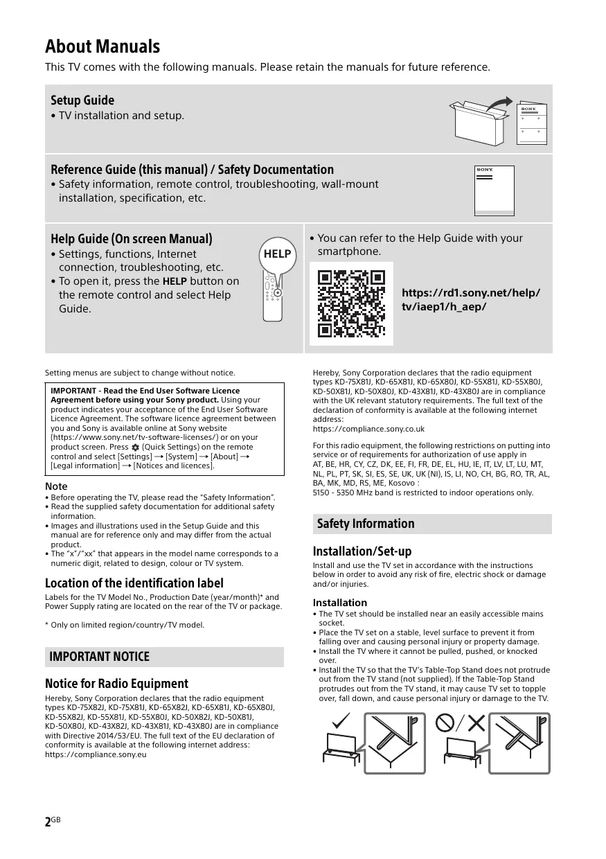 Hereby, Sony Corporation declares that the radio equipment types KD-75X82J, KD-75X81J, KD-65X82J, KD-65X81J, KD-65X80J, KD-55X82J, KD-55X81J, KD-55X80J, KD-50X82J, KD-50X81J, KD-50X80J, KD-43X82J, KD-43X81J, KD-43X80J are in compliance with Directive 2014/53/EU. The full text of the EU declaration of conformity is available at the following internet address: https://compliance.sony.eu