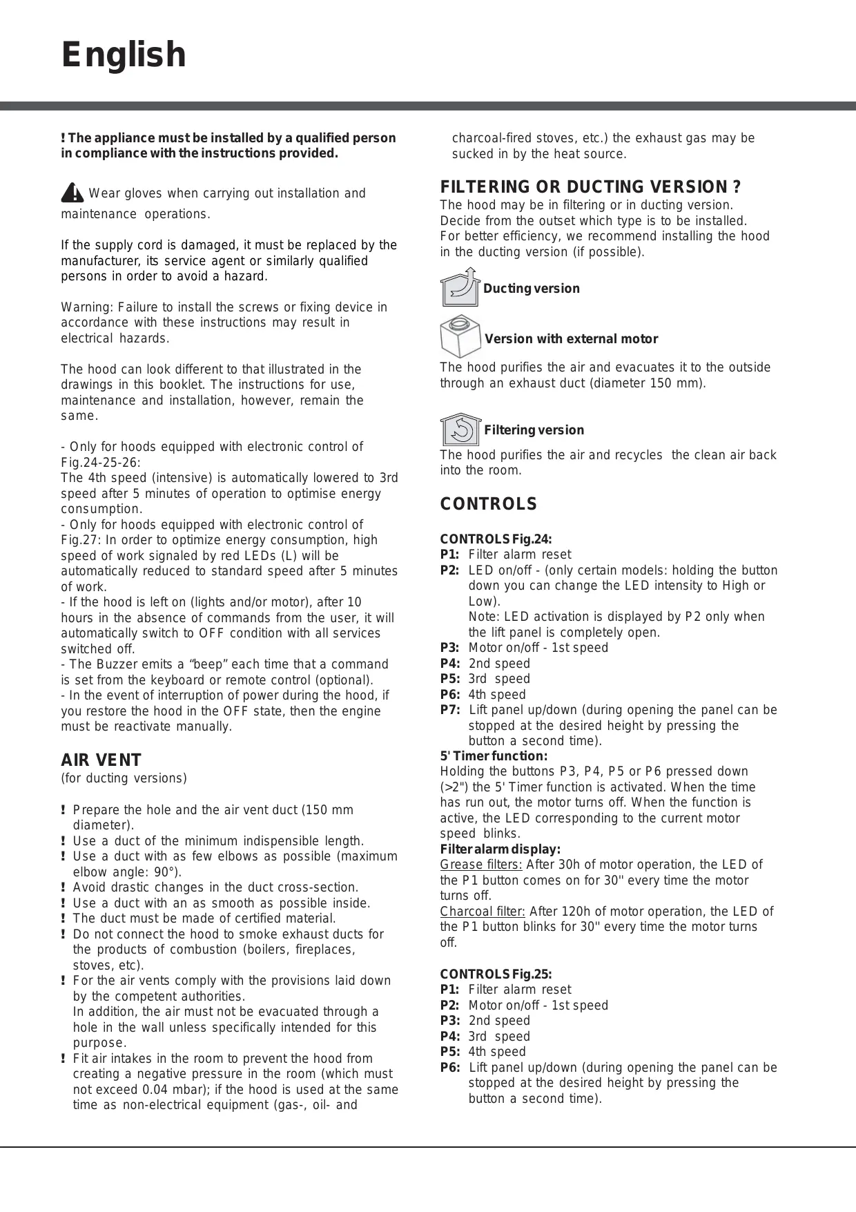 Grease filters: After 30h of motor operation, the LED of the P1 button comes on for 30'' every time the motor turns off.