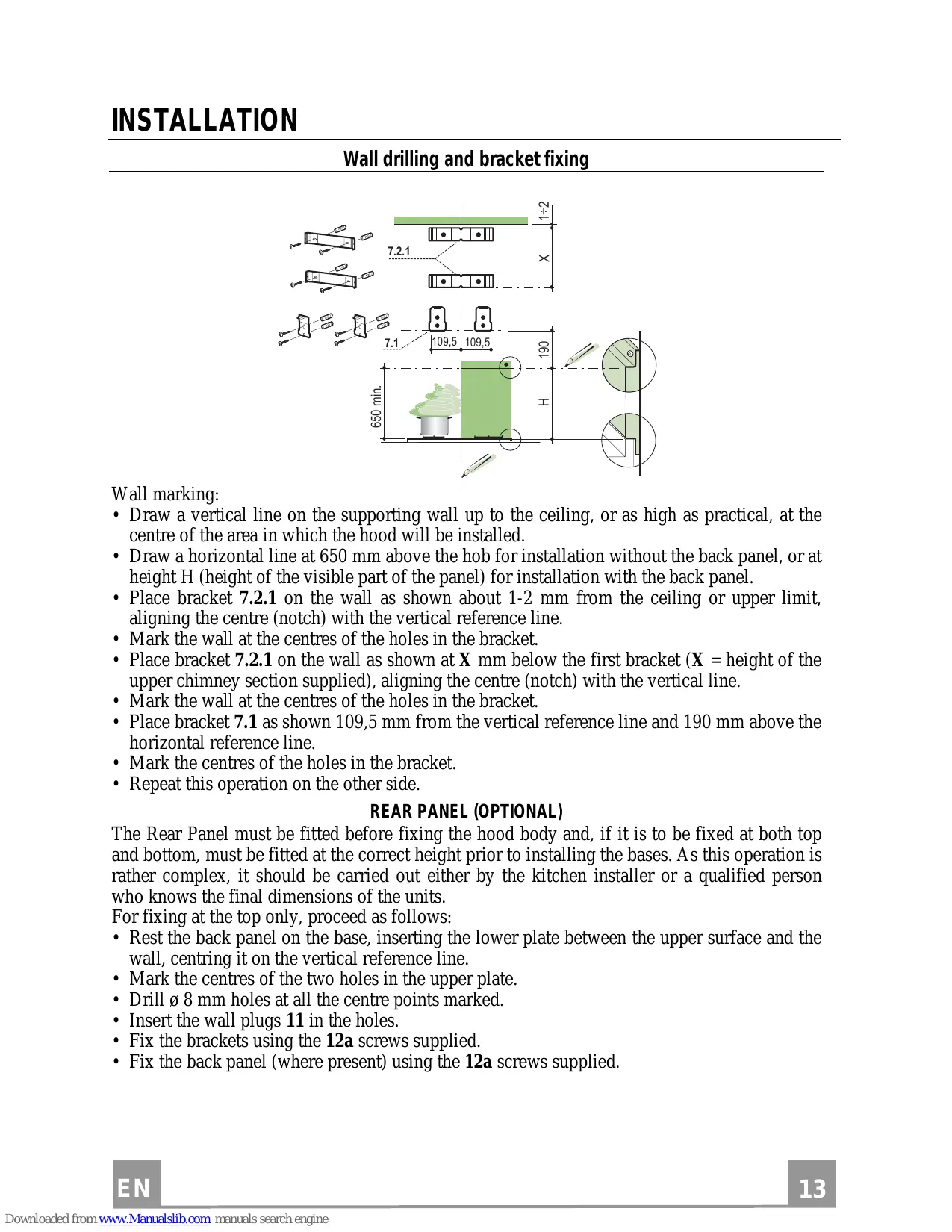 • Draw a vertical line on the supporting wall up to the ceiling, or as high as practical, at the centre of the area in which the hood will be installed. • Draw a horizontal line at 650 mm above the hob for installation without the back panel, or at height H (height of the visible part of the panel) for installation with the back panel. • Place bracket 7.2.1 on the wall as shown about 1-2 mm from the ceiling or upper limit, aligning the centre (notch) with the vertical reference line. • Mark the wall at the centres of the holes in the bracket. • Place bracket 7.2.1 on the wall as shown at X mm below the first bracket (X = height of the upper chimney section supplied), aligning the centre (notch) with the vertical line. • Mark the wall at the centres of the holes in the bracket. • Place bracket 7.1 as shown 109,5 mm from the vertical reference line and 190 mm above the horizontal reference line. • Mark the centres of the holes in the bracket. • Repeat this operation on the other side. REAR PANEL (OPTIONAL) The Rear Panel must be fitted before fixing the hood body and, if it is to be fixed at both top and bottom, must be fitted at the correct height prior to installing the bases. As this operation is rather complex, it should be carried out either by the kitchen installer or a qualified person who knows the final dimensions of the units. For fixing at the top only, proceed as follows: • Rest the back panel on the base, inserting the lower plate between the upper surface and the wall, centring it on the vertical reference line. • Mark the centres of the two holes in the upper plate. • Drill ø 8 mm holes at all the centre points marked. • Insert the wall plugs 11 in the holes. • Fix the brackets using the 12a screws supplied. • Fix the back panel (where present) using the 12a screws supplied.