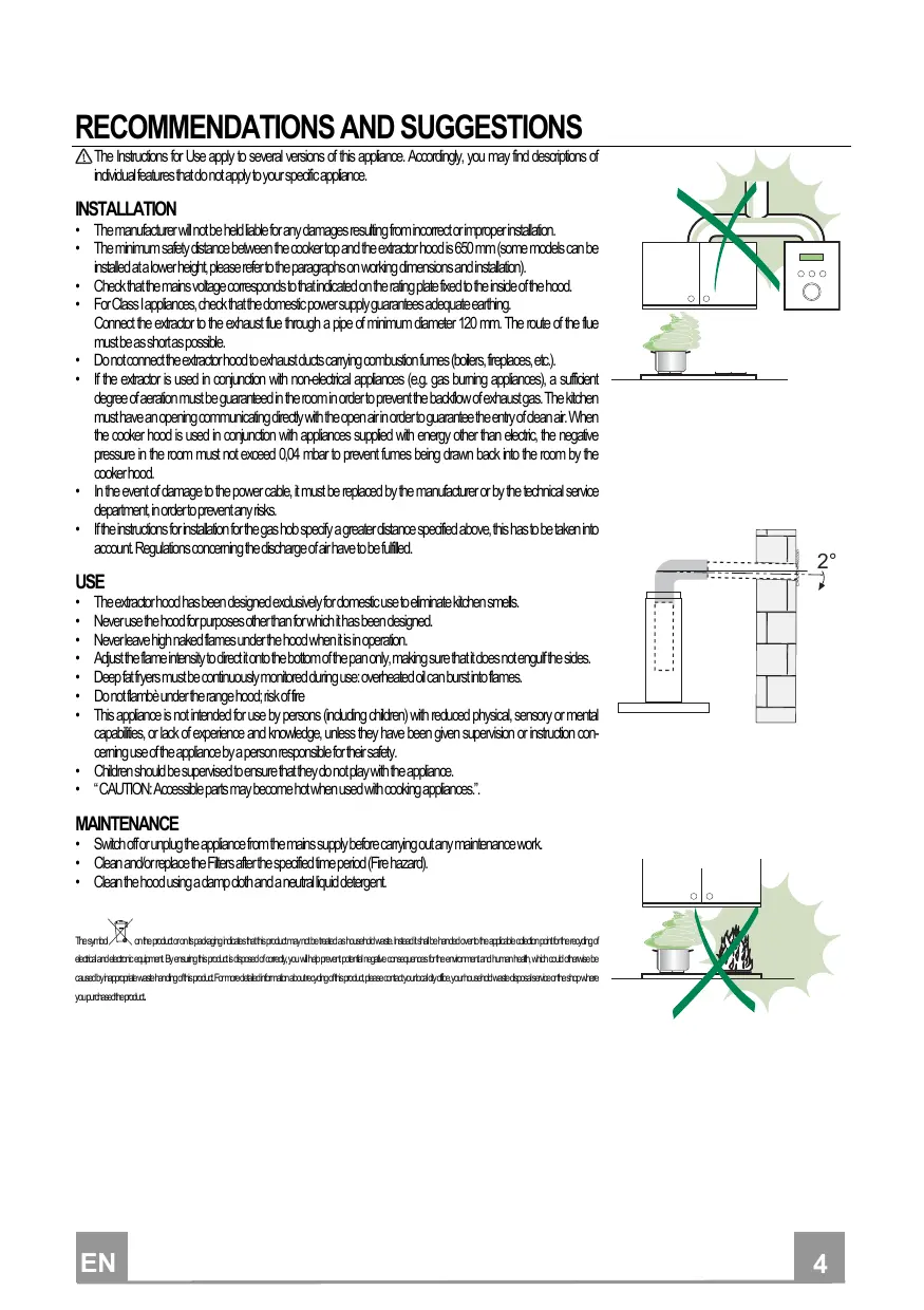 1 - SAFETY WARNINGS 1.1 - When used in the extraction mode, the cooker hood ducting must not be connected to a flue which is used for exhausting fumes from appliances supplied with energy other than electric, such as a central heating flue or water heating flue. 1.2 - Before connecting to the mains supply ensure that the mains voltage corresponds with the voltage on the rating plate inside the hood. 1.3 - Connect the cooker hood to the mains via a double poled switch which has 3mm clearance between the contacts. 1.4 - For cooker hoods featuring an earth cable, make sure the electric plant of your house is correctly earthed. 1.5 - Appliance in class II are provided with a double insulation; therefore do not connect them through earthed plugs but through a double poled plugs. 1.6 - When installed, the hood must be positioned at least 65cm above the hotplate. 1.7 - Never do flambé cooking under this cooker hood. 1.8 - Never leave frying pans unattended during use as overheated fat and oil may catch fire. 1.9 - Before carrying out any kind of maintenance or cleaning, disconnect the hood from the mains supply. 1.10- If the room where the cooker hood is to be used contains a fuel burning appliance such as a central heating boiler then this must be of the room sealed or balanced flue type. If other types of flue or appliance are fitted, ensure that there is an adequate supply of air into the room. When the cooker hood is used in conjunction with appliances supplied with energy other than electric, the negative pressure in the room must not exceed 0,04 mbar to prevent fumes being drawn back into the room by the cooker hood. 1.11- The appliance must be positioned so that the plug is accessible. 1.12- If the supply cord is damaged, it must be replaced by a special cord or assembly available from the manufacturer or its service agent. 1.13- This appliance is not intended for use by persons (including children) with reduced physical, sensory or mental capabilities, or lack of experience and knowledge, unless they have been given supervision or instruction concerning use of the appliance by a person responsible for their safety. 1.14- Children should be supervised to ensure that they do not play with the appliance.