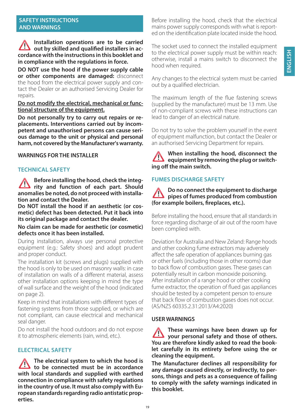 EN - Assembly of factory-fitted filter (15)+(16). SAFETY INSTRUCTIONS AND WARNINGS Installation operations are to be carried out by skilled and qualified installers in accordance with the instructions in this booklet and in compliance with the regulations in force. DO NOT use the hood if the power supply cable or other components are damaged: disconnect the hood from the electrical power supply and contact the Dealer or an authorised Servicing Dealer for repairs. Do not modify the electrical, mechanical or functional structure of the equipment. Do not personally try to carry out repairs or replacements. Interventions carried out by incompetent and unauthorised persons can cause serious damage to the unit or physical and personal harm, not covered by the Manufacturer's warranty. The socket used to connect the installed equipment to the electrical power supply must be within reach: otherwise, install a mains switch to disconnect the hood when required. Any changes to the electrical system must be carried out by a qualified electrician. The maximum length of the flue fastening screws (supplied by the manufacturer) must be 13 mm. Use of non-compliant screws with these instructions can lead to danger of an electrical nature. Do not try to solve the problem yourself in the event of equipment malfunction, but contact the Dealer or an authorised Servicing Department for repairs. When installing the hood, disconnect the equipment by removing the plug or switching off the main switch. Before installing the hood, check the integrity and function of each part. Should anomalies be noted, do not proceed with installation and contact the Dealer. Do NOT install the hood if an aesthetic (or cosmetic) defect has been detected. Put it back into its original package and contact the dealer. No claim can be made for aesthetic (or cosmetic) defects once it has been installed. During installation, always use personal protective equipment (e.g.: Safety shoes) and adopt prudent and proper conduct. The installation kit (screws and plugs) supplied with the hood is only to be used on masonry walls: in case of installation on walls of a different material, assess other installation options keeping in mind the type of wall surface and the weight of the hood (indicated on page 2). Keep in mind that installations with different types of fastening systems from those supplied, or which are not compliant, can cause electrical and mechanical seal danger. Do not install the hood outdoors and do not expose it to atmospheric elements (rain, wind, etc.). Do no connect the equipment to discharge pipes of fumes produced from combustion (for example boilers, fireplaces, etc.). Before installing the hood, ensure that all standards in force regarding discharge of air out of the room have been complied with. Deviation for Australia and New Zeland: Range hoods and other cooking fume extractors may adversely affect the safe operation of appliances burning gas or other fuels (including those in other rooms) due to back flow of combustion gases. These gases can potentially result in carbon monoxide poisoning. After installation of a range hood or other cooking fume extractor, the operation of flued gas appliances should be tested by a competent person to ensure that back flow of combustion gases does not occur. (AS/NZS 60335.2.31:2013/A4:2020) USER WARNINGS These warnings have been drawn up for your personal safety and those of others. You are therefore kindly asked to read the booklet carefully in its entirety before using the or cleaning the equipment. The Manufacturer declines all responsibility for any damage caused directly, or indirectly, to persons, things and pets as a consequence of failing to comply with the safety warnings indicated in this booklet. ELECTRICAL SAFETY The electrical system to which the hood is to be connected must be in accordance with local standards and supplied with earthed connection in compliance with safety regulations in the country of use. It must also comply with European standards regarding radio antistatic properties.