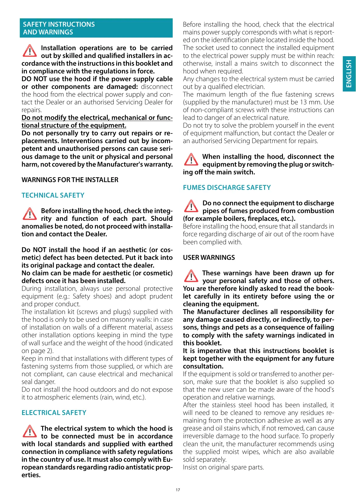 TECHNICAL SAFETY Do no connect the equipment to discharge pipes of fumes produced from combustion (for example boilers, fireplaces, etc.). Before installing the hood, ensure that all standards in force regarding discharge of air out of the room have been complied with. Before installing the hood, check the integrity and function of each part. Should anomalies be noted, do not proceed with installation and contact the Dealer. Do NOT install the hood if an aesthetic (or cosmetic) defect has been detected. Put it back into its original package and contact the dealer. No claim can be made for aesthetic (or cosmetic) defects once it has been installed. During installation, always use personal protective equipment (e.g.: Safety shoes) and adopt prudent and proper conduct. The installation kit (screws and plugs) supplied with the hood is only to be used on masonry walls: in case of installation on walls of a different material, assess other installation options keeping in mind the type of wall surface and the weight of the hood (indicated on page 2). Keep in mind that installations with different types of fastening systems from those supplied, or which are not compliant, can cause electrical and mechanical seal danger. Do not install the hood outdoors and do not expose it to atmospheric elements (rain, wind, etc.). USER WARNINGS These warnings have been drawn up for your personal safety and those of others. You are therefore kindly asked to read the booklet carefully in its entirety before using the or cleaning the equipment. The Manufacturer declines all responsibility for any damage caused directly, or indirectly, to persons, things and pets as a consequence of failing to comply with the safety warnings indicated in this booklet. It is imperative that this instructions booklet is kept together with the equipment for any future consultation. If the equipment is sold or transferred to another person, make sure that the booklet is also supplied so that the new user can be made aware of the hood's operation and relative warnings. After the stainless steel hood has been installed, it will need to be cleaned to remove any residues remaining from the protection adhesive as well as any grease and oil stains which, if not removed, can cause irreversible damage to the hood surface. To properly clean the unit, the manufacturer recommends using the supplied moist wipes, which are also available sold separately. Insist on original spare parts. ELECTRICAL SAFETY The electrical system to which the hood is to be connected must be in accordance with local standards and supplied with earthed connection in compliance with safety regulations in the country of use. It must also comply with European standards regarding radio antistatic properties.
