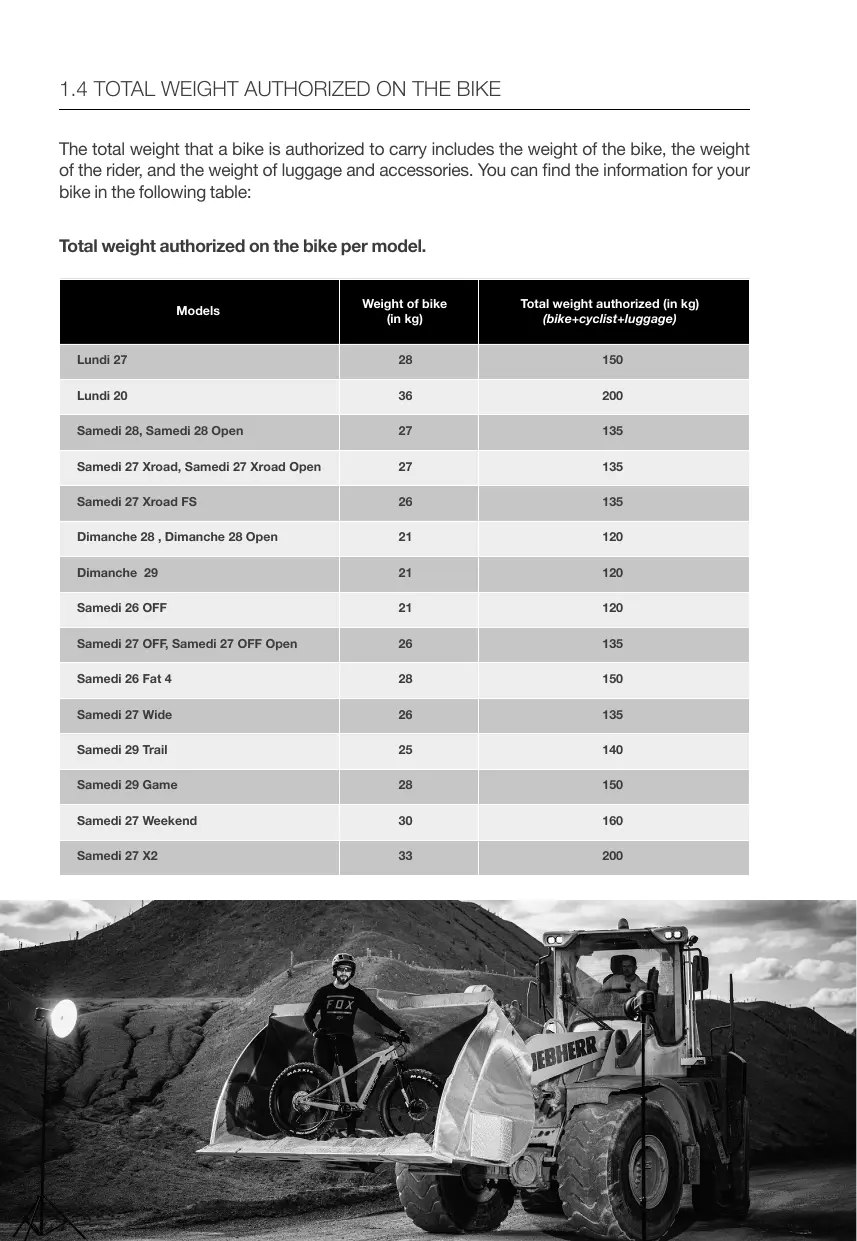 1.4 TOTAL WEIGHT AUTHORIZATION ON THE BIKE 58