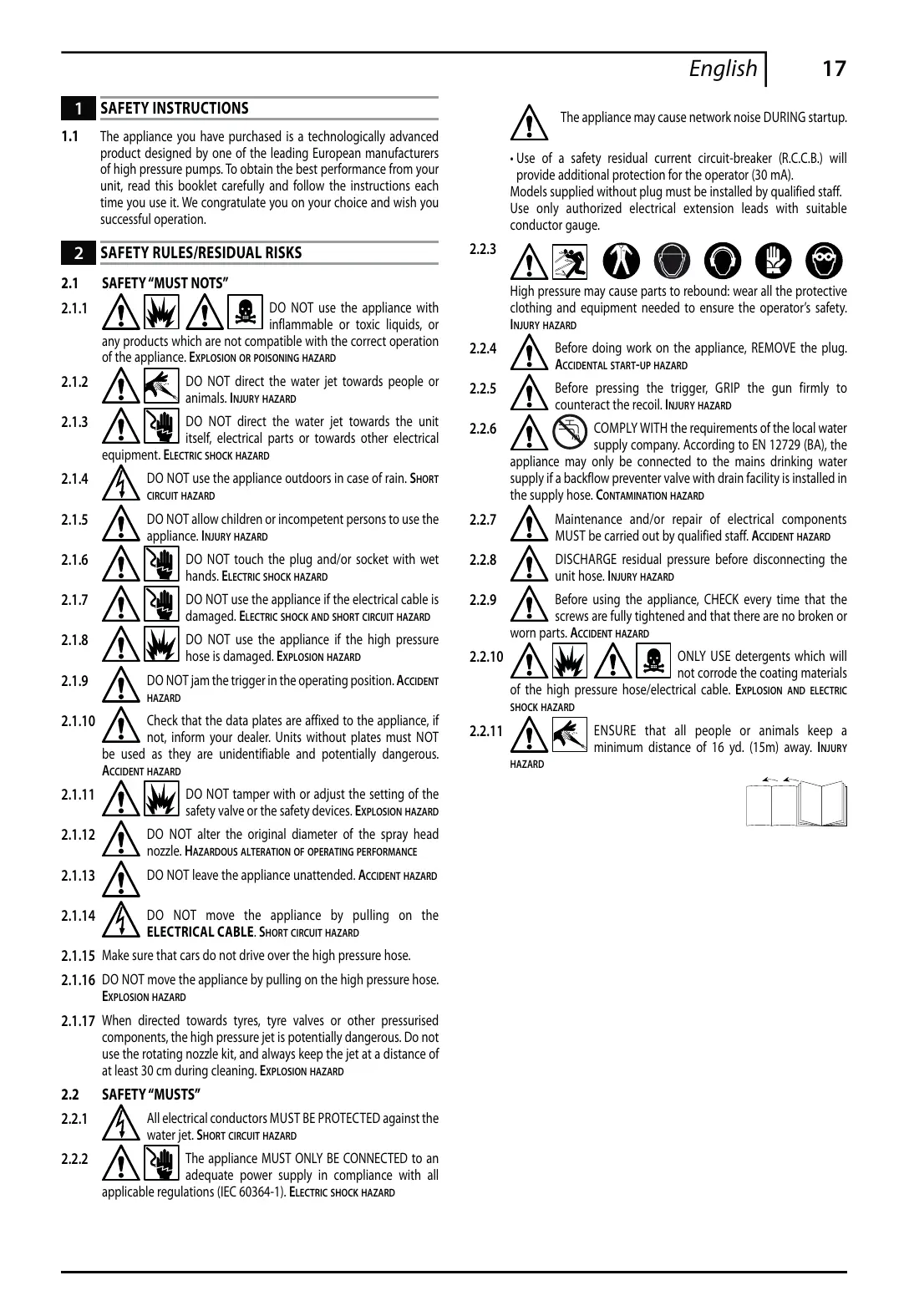 2.1.16 DO NOT move the appliance by pulling on the high pressure hose. EXPLOSION HAZARD