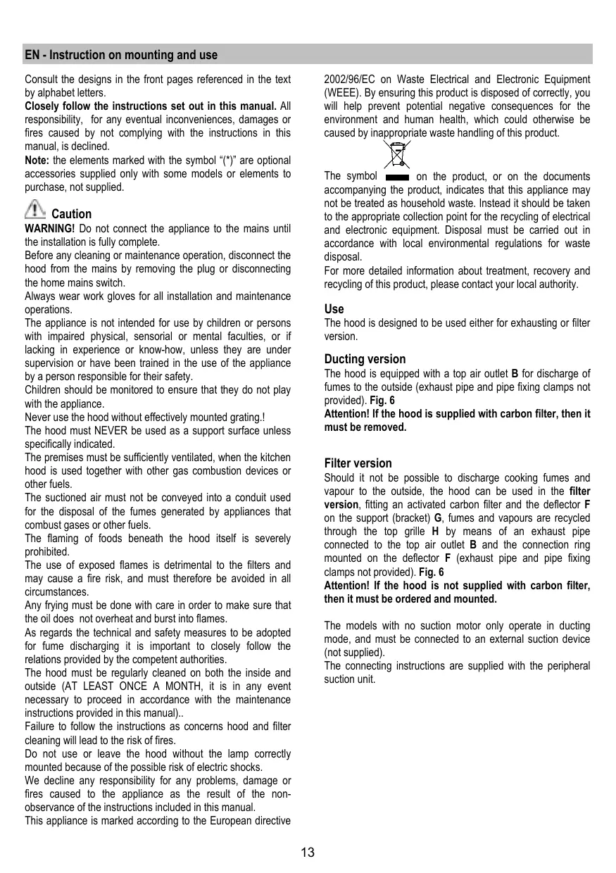 WARNING! Do not connect the appliance to the mains until the installation is fully complete. Before any cleaning or maintenance operation, disconnect the hood from the mains by removing the plug or disconnecting the home mains switch. Always wear work gloves for all installation and maintenance operations. The appliance is not intended for use by children or persons with impaired physical, sensorial or mental faculties, or if lacking in experience or know-how, unless they are under supervision or have been trained in the use of the appliance by a person responsible for their safety. Children should be monitored to ensure that they do not play with the appliance. Never use the hood without effectively mounted grating.! The hood must NEVER be used as a support surface unless specifically indicated. The premises must be sufficiently ventilated, when the kitchen hood is used together with other gas combustion devices or other fuels. The suctioned air must not be conveyed into a conduit used for the disposal of the fumes generated by appliances that combust gases or other fuels. The flaming of foods beneath the hood itself is severely prohibited. The use of exposed flames is detrimental to the filters and may cause a fire risk, and must therefore be avoided in all circumstances. Any frying must be done with care in order to make sure that the oil does not overheat and burst into flames. As regards the technical and safety measures to be adopted for fume discharging it is important to closely follow the relations provided by the competent authorities. The hood must be regularly cleaned on both the inside and outside (AT LEAST ONCE A MONTH, it is in any event necessary to proceed in accordance with the maintenance instructions provided in this manual).. Failure to follow the instructions as concerns hood and filter cleaning will lead to the risk of fires. Do not use or leave the hood without the lamp correctly mounted because of the possible risk of electric shocks. We decline any responsibility for any problems, damage or fires caused to the appliance as the result of the nonobservance of the instructions included in this manual. This appliance is marked according to the European directive