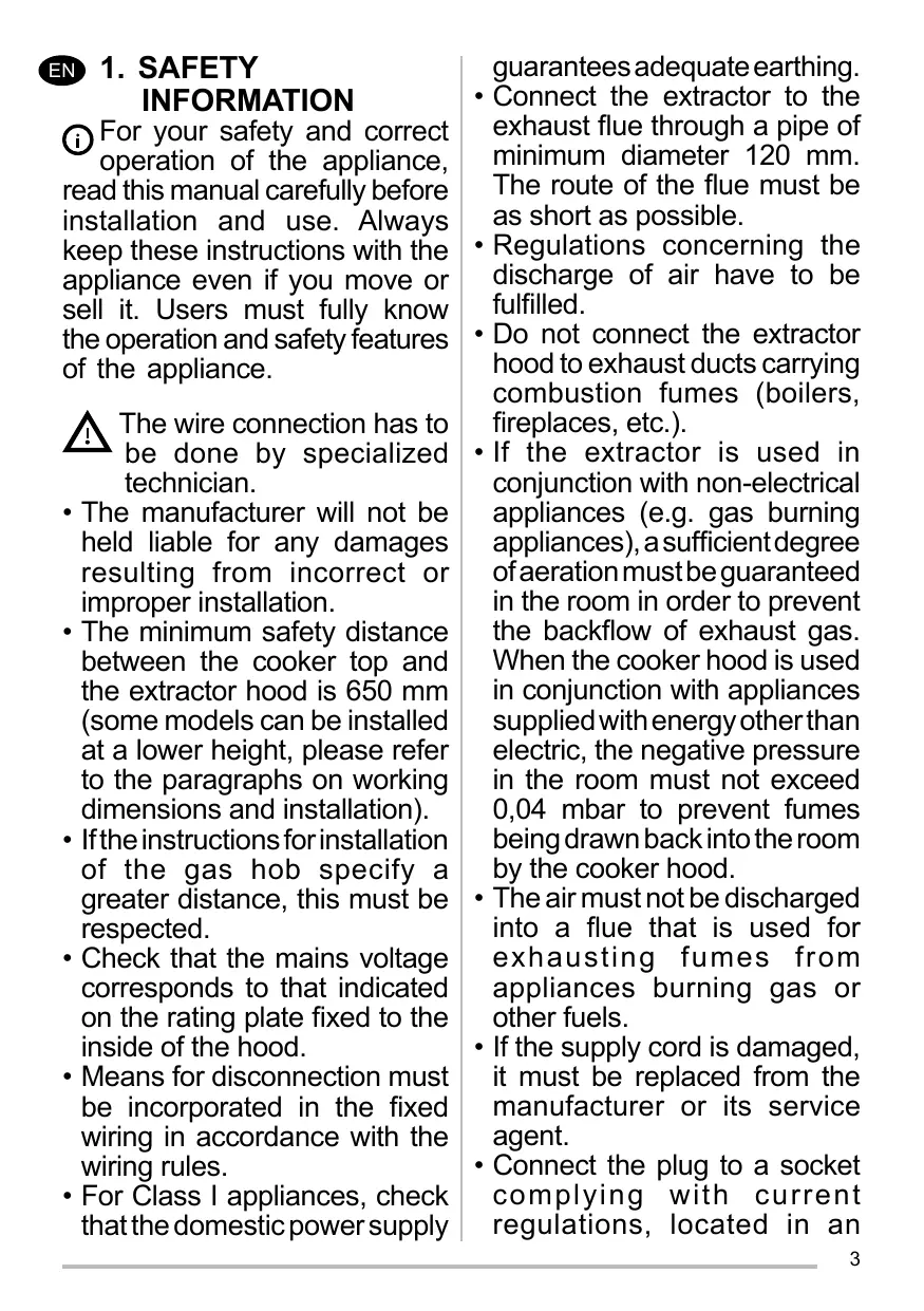 Connect the extractor to the exhaust flue through a pipe of minimum diameter 120 mm. The route of the flue must be as short as possible. Regulations concerning the discharge of air have to be fulfilled. Do not connect the extractor hood to exhaust ducts carrying combustion fumes (boilers, fireplaces, etc.). If the extractor is used in conjunction with non-electrical appliances (e.g. gas burning appliances), a sufficient degree of aeration must be guaranteed in the room in order to prevent the backflow of exhaust gas. When the cooker hood is used in conjunction with appliances supplied with energy other than electric, the negative pressure in the room must not exceed 0,04 mbar to prevent fumes being drawn back into the room by the cooker hood. The air must not be discharged into a flue that is used for exhausting fumes from appliances burning gas or other fuels. If the supply cord is damaged, it must be replaced from the manufacturer or its service agent. Connect the plug to a socket complying with current regulations, located in an 3