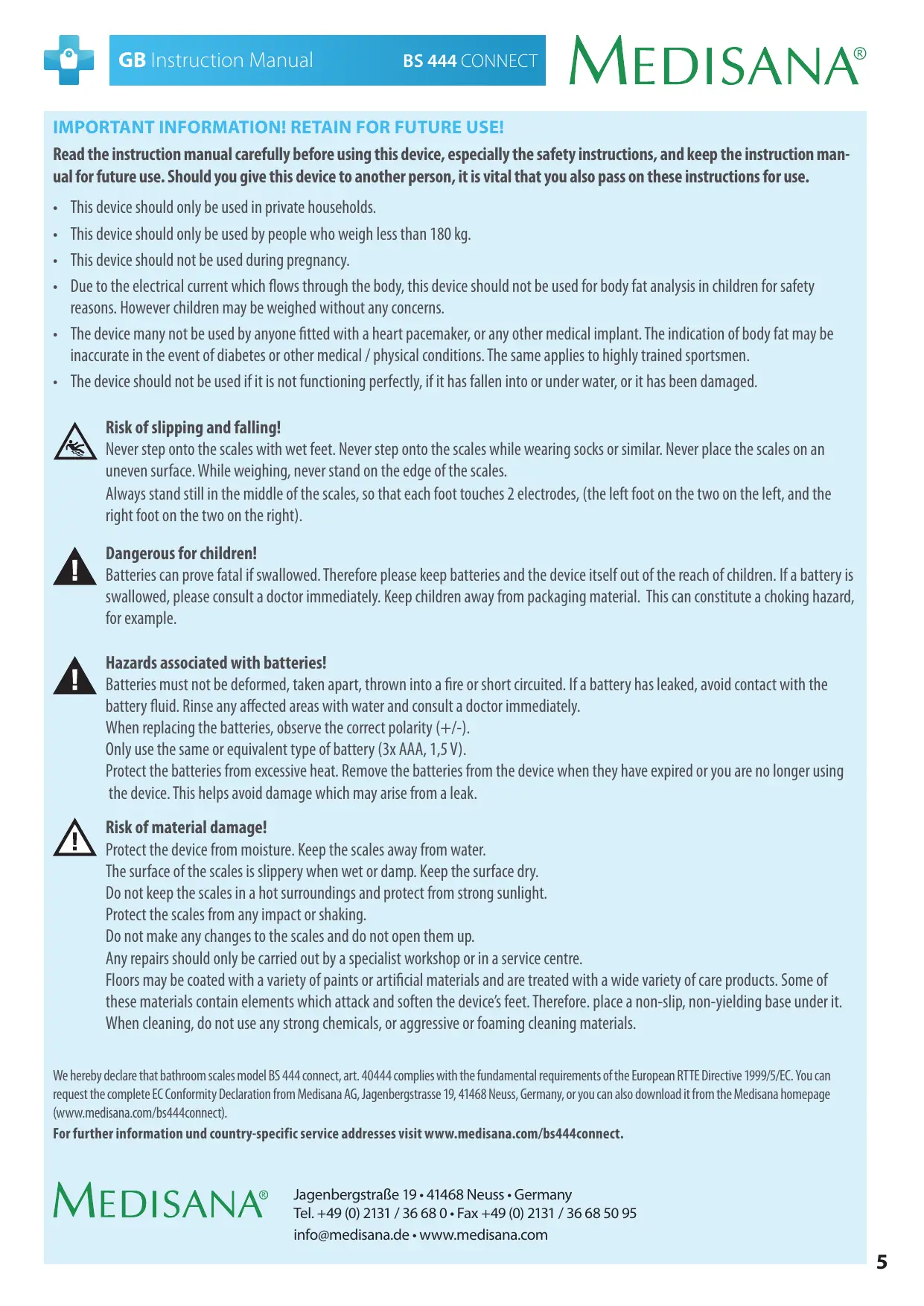 Risk of slipping and falling! Never step onto the scales with wet feet. Never step onto the scales while wearing socks or similar. Never place the scales on an uneven surface. While weighing, never stand on the edge of the scales. Always stand still in the middle of the scales, so that each foot touches 2 electrodes, (the left foot on the two on the left, and the right foot on the two on the right). Dangerous for children! Batteries can prove fatal if swallowed. Therefore please keep batteries and the device itself out of the reach of children. If a battery is swallowed, please consult a doctor immediately. Keep children away from packaging material. This can constitute a choking hazard, for example. Hazards associated with batteries! Batteries must not be deformed, taken apart, thrown into a fire or short circuited. If a battery has leaked, avoid contact with the battery fluid. Rinse any affected areas with water and consult a doctor immediately. When replacing the batteries, observe the correct polarity (+/-). Only use the same or equivalent type of battery (3x AAA, 1,5 V). Protect the batteries from excessive heat. Remove the batteries from the device when they have expired or you are no longer using the device. This helps avoid damage which may arise from a leak. Risk of material damage! Protect the device from moisture. Keep the scales away from water. The surface of the scales is slippery when wet or damp. Keep the surface dry. Do not keep the scales in a hot surroundings and protect from strong sunlight. Protect the scales from any impact or shaking. Do not make any changes to the scales and do not open them up. Any repairs should only be carried out by a specialist workshop or in a service centre. Floors may be coated with a variety of paints or artificial materials and are treated with a wide variety of care products. Some of these materials contain elements which attack and soften the device’s feet. Therefore. place a non-slip, non-yielding base under it. When cleaning, do not use any strong chemicals, or aggressive or foaming cleaning materials. We hereby declare that bathroom scales model BS 444 connect, art. 40444 complies with the fundamental requirements of the European RTTE Directive 1999/5/EC. You can request the complete EC Conformity Declaration from Medisana AG, Jagenbergstrasse 19, 41468 Neuss, Germany, or you can also download it from the Medisana homepage (www.medisana.com/bs444connect). For further information und country-specific service addresses visit www.medisana.com/bs444connect. Instruction Manual GB Simply stand on the scales barefoot (without socks or similar).
