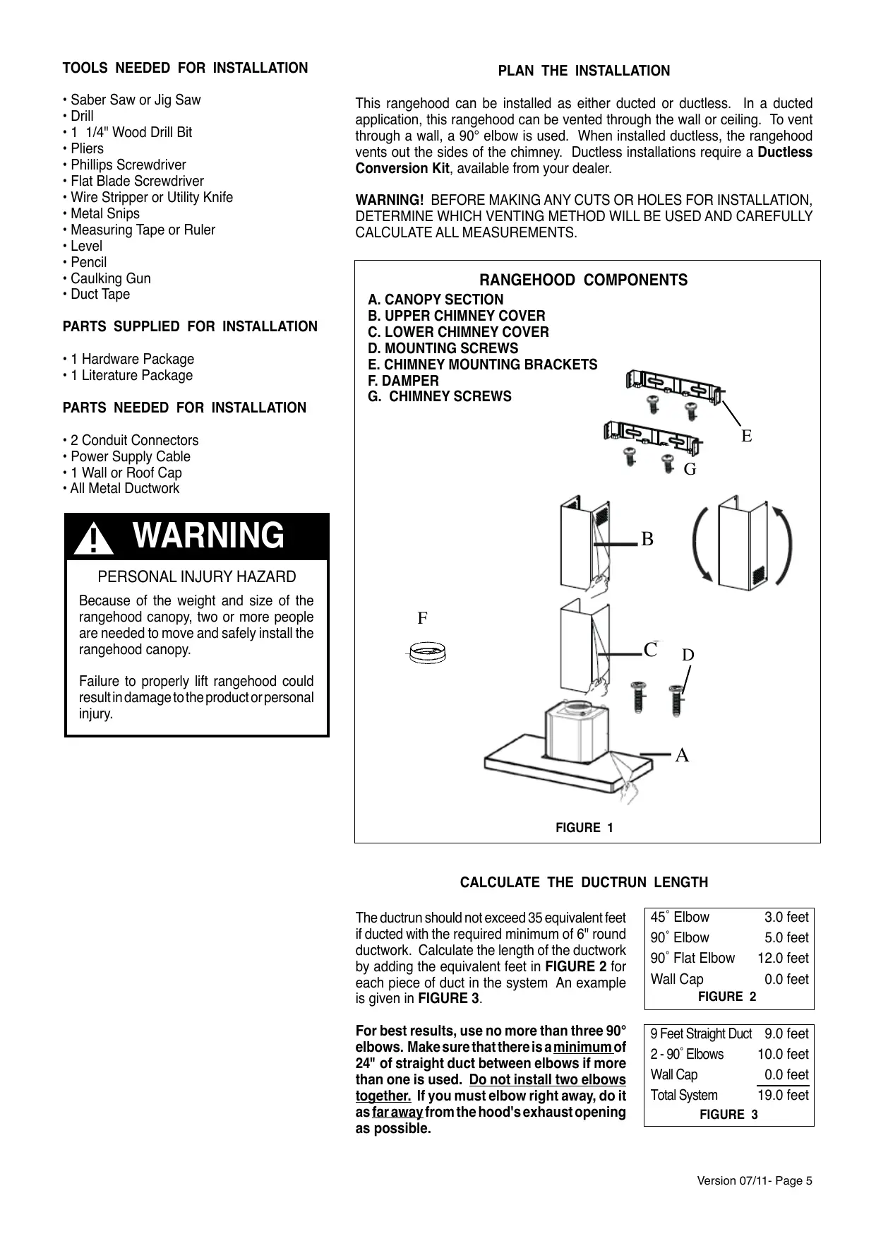 The ductrun should not exceed 35 equivalent feet if ducted with the required minimum of 6'' round ductwork. Calculate the length of the ductwork by adding the equivalent feet in FIGURE 2 for each piece of duct in the system An example is given in FIGURE 3.