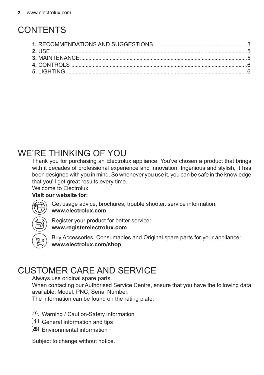When contacting our Authorised Service Centre, ensure that you have the following data available: Model, PNC, Serial Number. The information can be found on the rating plate. Warning / Caution-Safety information General information and tips Environmental information Subject to change without notice.
