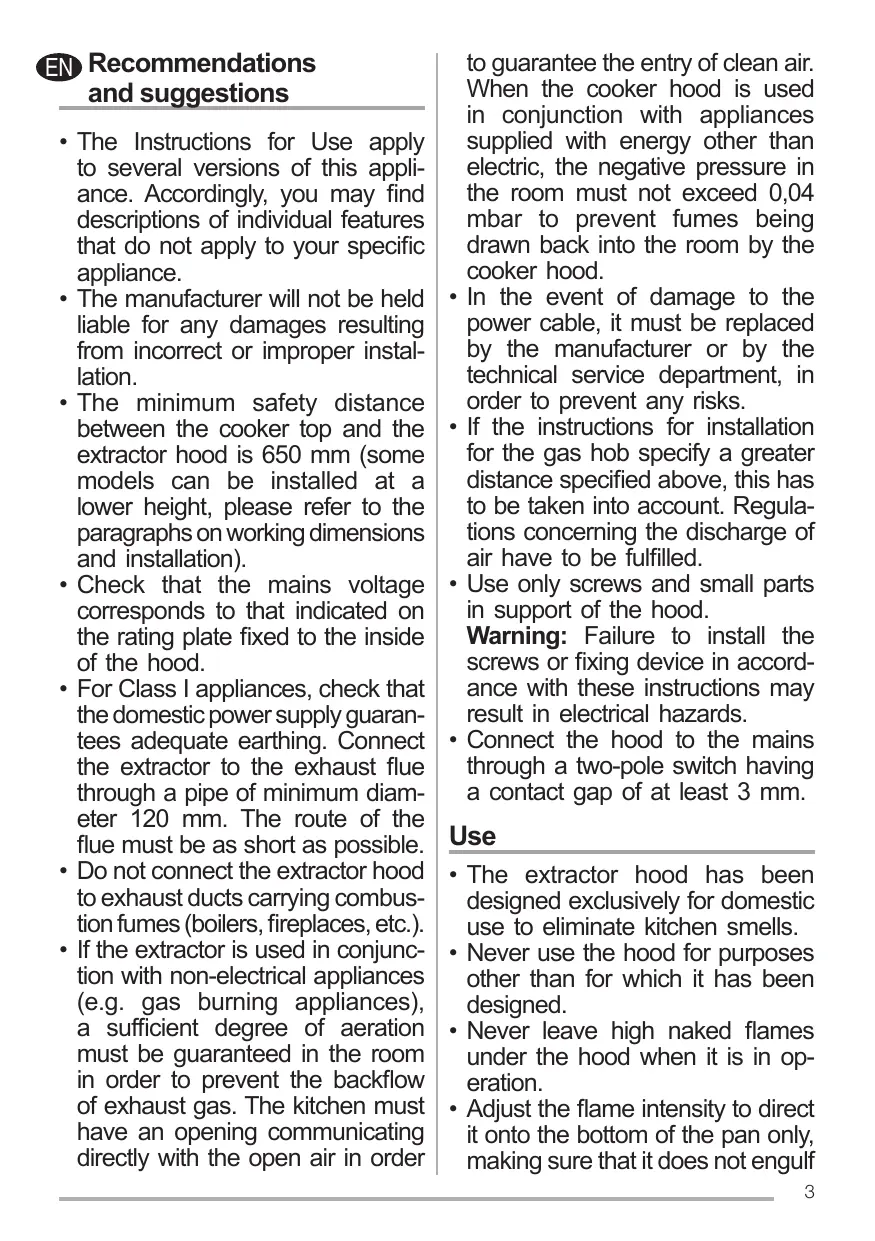 For Class | appliances, check that the domestic power supply guaran- tees adequate earthing. Connect the extractor to the exhaust flue through a pipe of minimum diam- eter 120 mm. The route of the flue must be as short as possible. Do not connect the extractor hood to exhaust ducts carrying combus- tion fumes (boilers, fireplaces, etc.). If the extractor is used in conjunc- tion with non-electrical appliances (e.g. gas burning appliances), a sufficient degree of aeration must be guaranteed in the room in order to prevent the backflow of exhaust gas. The kitchen must have an opening communicating directly with the open air in order