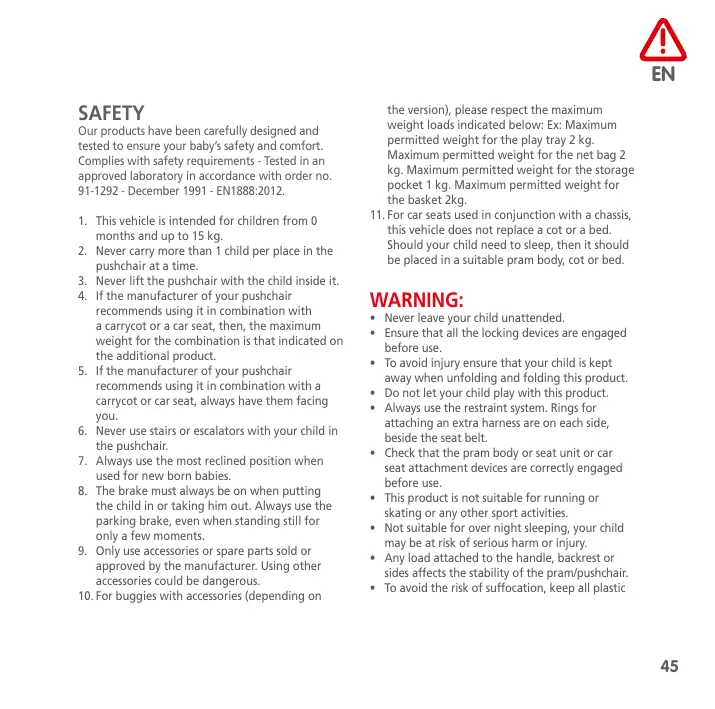 the version), please respect the maximum weight loads indicated below: Ex: Maximum permitted weight for the play tray 2 kg. Maximum permitted weight for the net bag 2 kg. Maximum permitted weight for the storage pocket 1 kg. Maximum permitted weight for the basket 2kg.